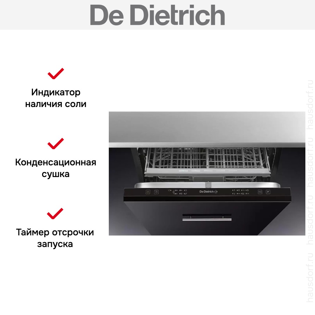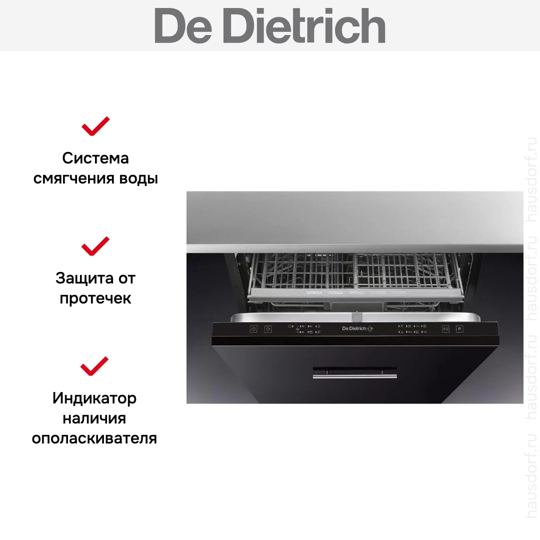 Встраиваемая модель Де Дитрих отлично впишется в любой интерьер, главное — правильно выбрать место, чтобы подвести коммуникации. Устанавливается в нишу целиком, полностью закрывается декоративной панелью. Обратите внимание: в комплекте не идет фасад, его необходимо установить самостоятельно. Имеет стандартные размеры, поэтому может не поместиться на очень маленькой кухне. В камеру можно загрузить ограниченное число комплектов: 14 шт. Комплектом считается набор посуды на одного человека, который нужен для полноценного приема пищи: глубокая и плоская тарелки, тарелка для салата, блюдце под чашку, сама чашка, ложка и вилка.