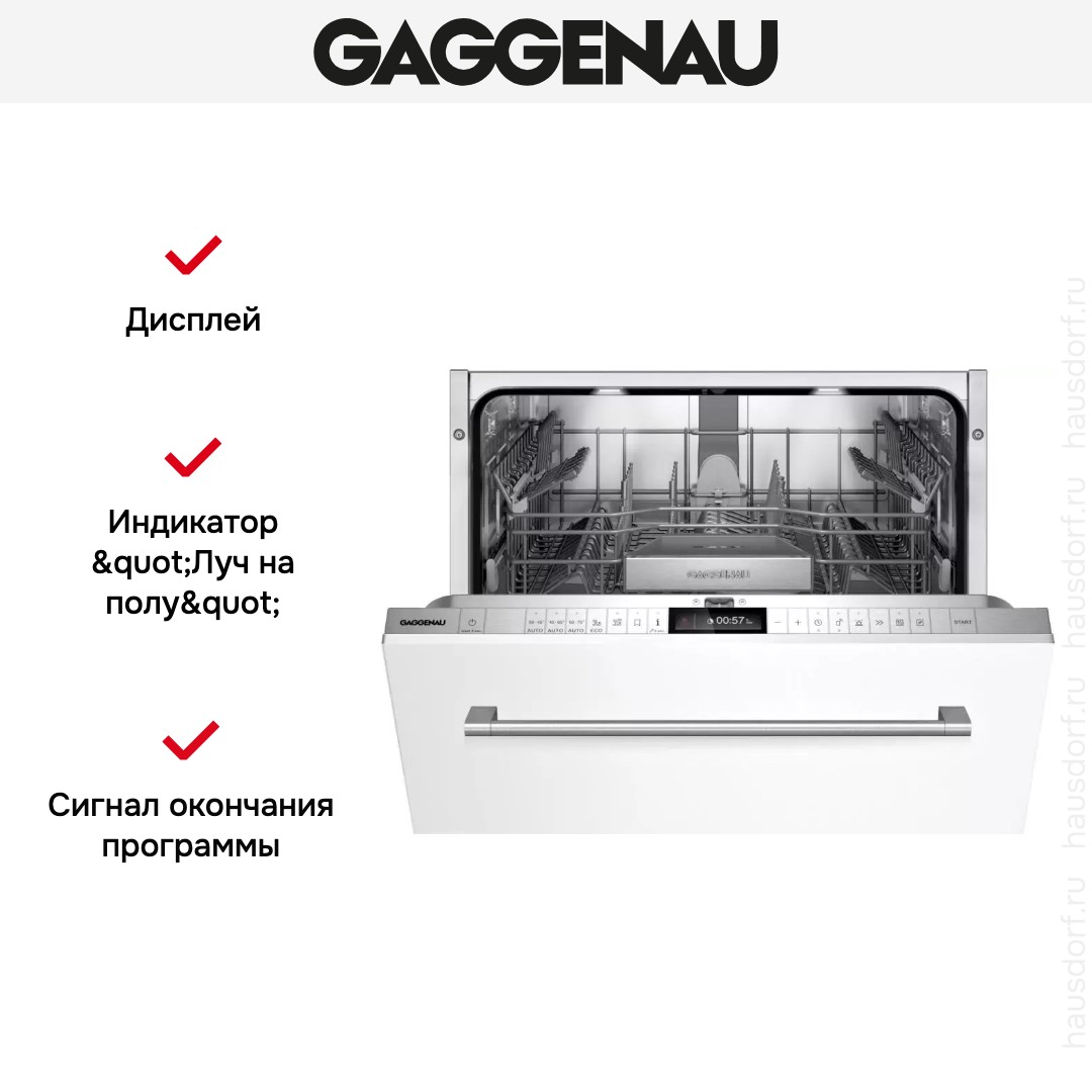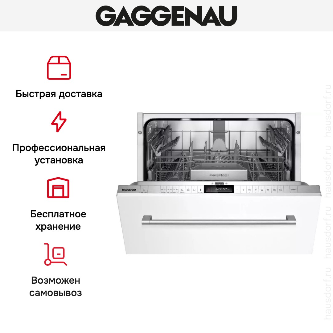 Встраиваемая модель Гаггенау отлично впишется в любой интерьер, главное — правильно выбрать место, чтобы подвести коммуникации. Устанавливается в нишу целиком, полностью закрывается декоративной панелью. Обратите внимание: в комплекте не идет фасад, его необходимо установить самостоятельно. Имеет стандартные размеры, поэтому может не поместиться на очень маленькой кухне. В камеру можно загрузить ограниченное число комплектов: 13 шт. Комплектом считается набор посуды на одного человека, который нужен для полноценного приема пищи: глубокая и плоская тарелки, тарелка для салата, блюдце под чашку, сама чашка, ложка и вилка.