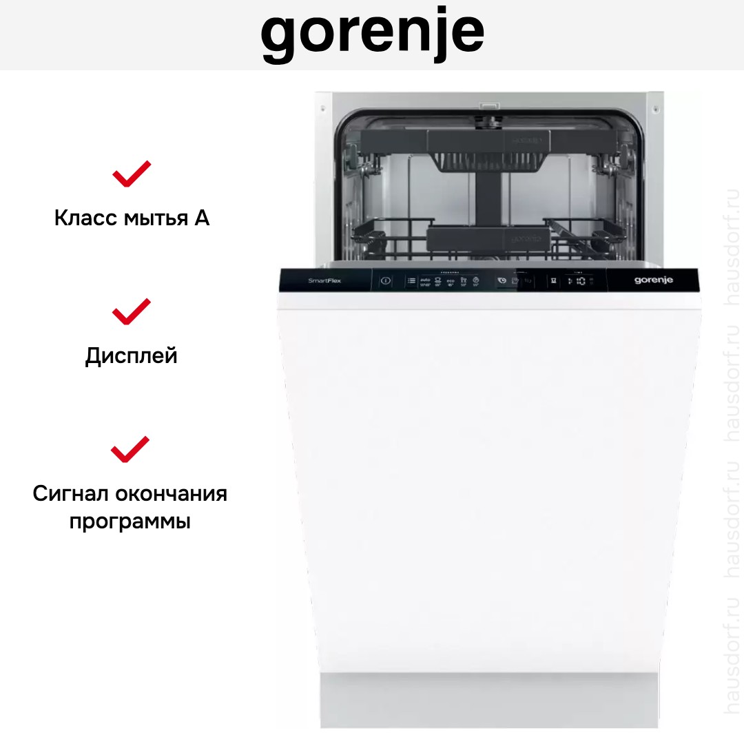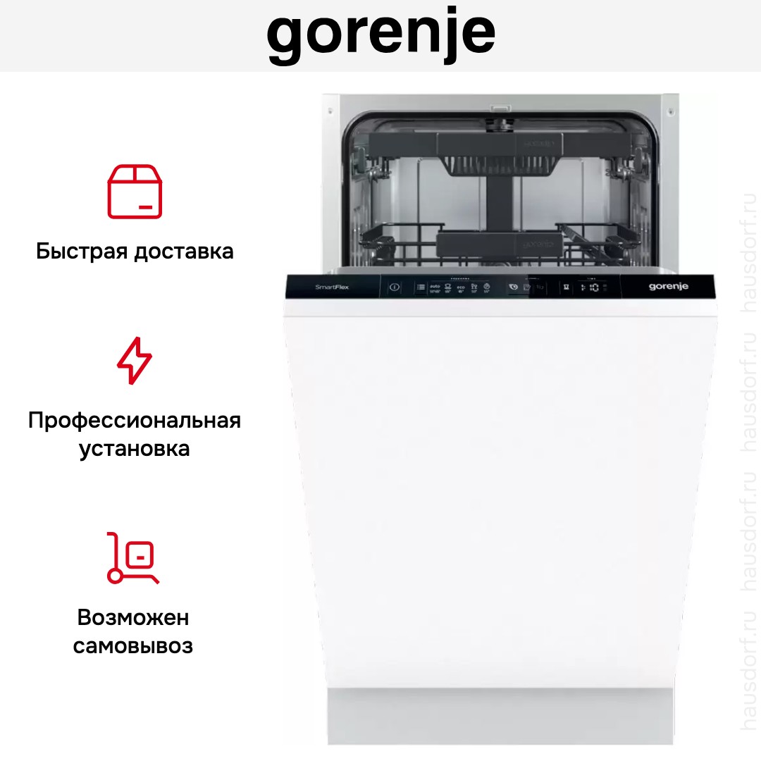 Посудомоечная машина Gorenje GV561D11 представляет собой узкую встраиваемую модель с полностью скрываемой фронтальной панелью и аккуратным черным блоком управления. Дизайн ориентирован на минимализм и бесшовную интеграцию под фасад кухни, что делает прибор незаметным в интерьере. Компактные габариты позволяют установить её в нишу стандартного кухонного гарнитура, при этом рабочая поверхность остается чистой и аккуратной.