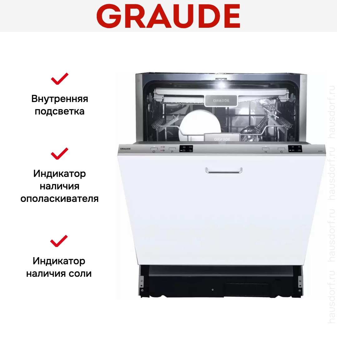 За безопасную эксплуатацию отвечает система защиты от протечек, а специальные индикаторы предупредят о том, что необходимо пополнить контейнеры с солью и ополаскивателем. Устройство оборудовано четырьмя программами мойки, среди которых есть режим половинной загрузки, что особенно важно для полноразмерных приборов. Внутри предусмотрена подсветка, которая хорошо освещает камеру для удобной загрузки и выгрузки. Наличие таймера расширяет функциональные возможности посудомоечной машины Грауде VG 60.0. Начало цикла можно запрограммировать на любое удобное время. Кнопочное управление отличается простотой и удобством настройки.