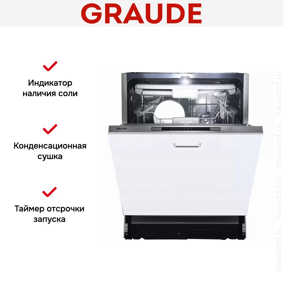 Семь стандартных программ включают бережную мойку для стекла и интенсивную Power Wash для удаления сильных загрязнений. Нагревательный элемент скрытого типа уменьшает образование накипи. Уровень шума этой модели составляет всего 47 дБ. Панель управления блокируется от случайного нажатия и игр детей с электрооборудованием. Наличие функции таймер расширяет возможности устройства, так как позволяет запрограммировать время включения. Это удобно, если вы захотите поставить цикл в ночное время, перед пробуждением. Специальная индикация оповещает пользователя о том, что необходимо пополнить резервуары с солью и ополаскивателем для продолжения качественной и эффективной работы. Защита от протечек гарантирует безопасную эксплуатацию посудомоечной машины Грауде VG 60.1.