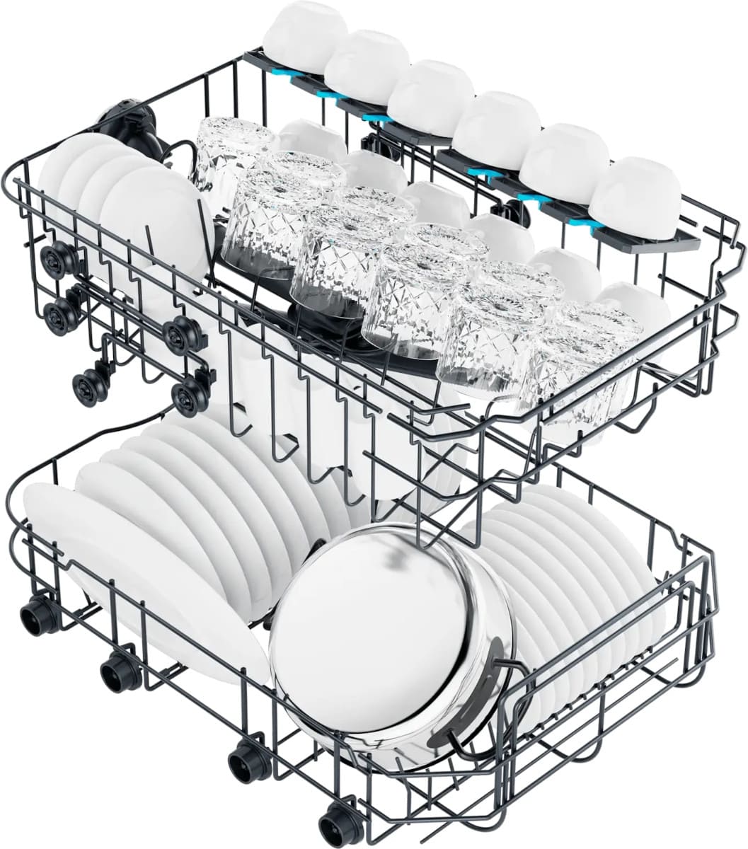 Полноразмерные модели выбирают в больших семьях, а также те, кто много готовит или часто принимает гостей. Их вместимость может составить до 15 комплектов посуды, а габаритные размеры соответствуют размерам стандартной кухонной мебели шириной и глубиной 60 см и высотой 82-85 см. Они выпускаются как во встраиваемом, так и в отдельностоящем варианте: во втором случае для установки понадобится достаточно много места. Как правило, полноразмерные приборы отличаются большим набором стандартных и специальных программ мойки, а также дополнительных опций: в частности, они оснащаются третьей корзиной для мытья столовых приборов.