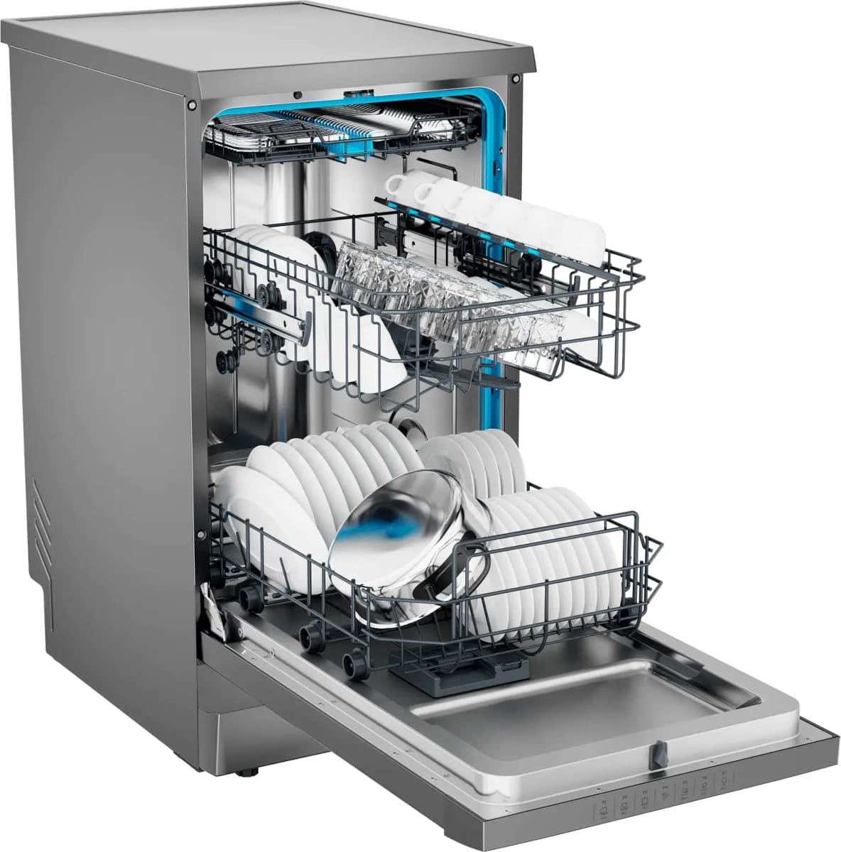 Отдельностоящая модель Хайер отлично впишется в кухонный интерьер, главное — правильно выбрать место, чтобы подвести коммуникации. Устанавливается в нишу неполностью, остается открытой панель управления. Имеет уменьшенную ширину — благодаря этому поместится даже на очень маленькой кухне. В камеру можно загрузить ограниченное число комплектов: 11 шт. Комплектом считается набор посуды на одного человека, который нужен для полноценного приема пищи: глубокая и плоская тарелки, тарелка для салата, блюдце под чашку, сама чашка, ложка и вилка.