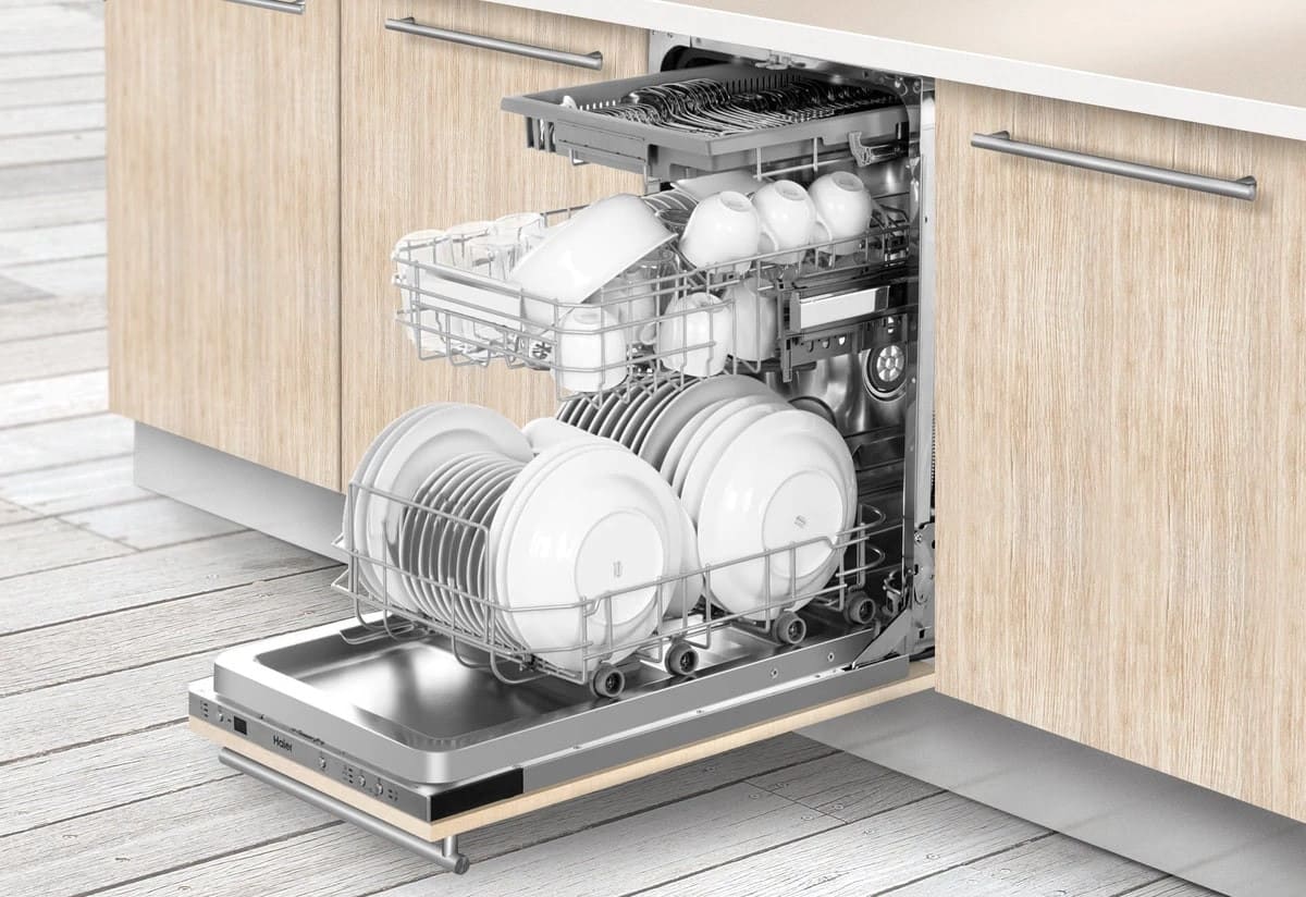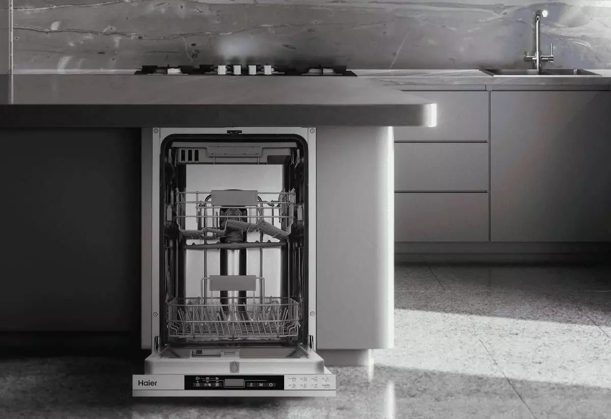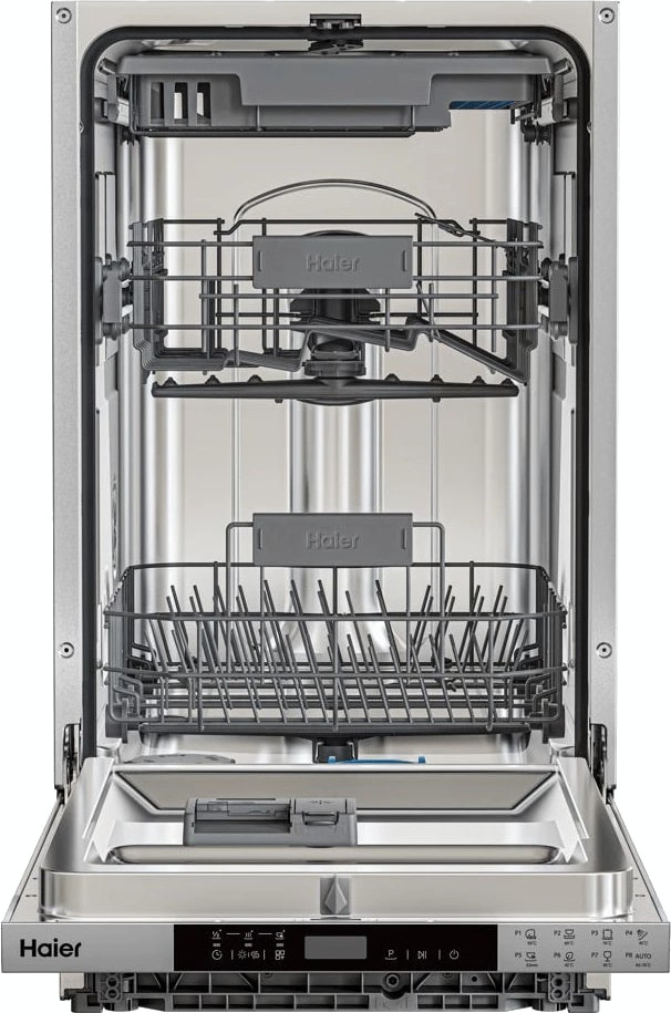 Встраиваемая модель Хайер отлично впишется в любой интерьер, главное — правильно выбрать место, чтобы подвести коммуникации. Устанавливается в нишу целиком, полностью закрывается декоративной панелью. Обратите внимание: в комплекте не идет фасад, его необходимо установить самостоятельно. Имеет уменьшенную ширину — благодаря этому поместится даже на очень маленькой кухне. В камеру можно загрузить ограниченное число комплектов: 11 шт. Комплектом считается набор посуды на одного человека, который нужен для полноценного приема пищи: глубокая и плоская тарелки, тарелка для салата, блюдце под чашку, сама чашка, ложка и вилка.