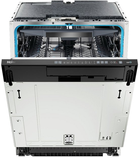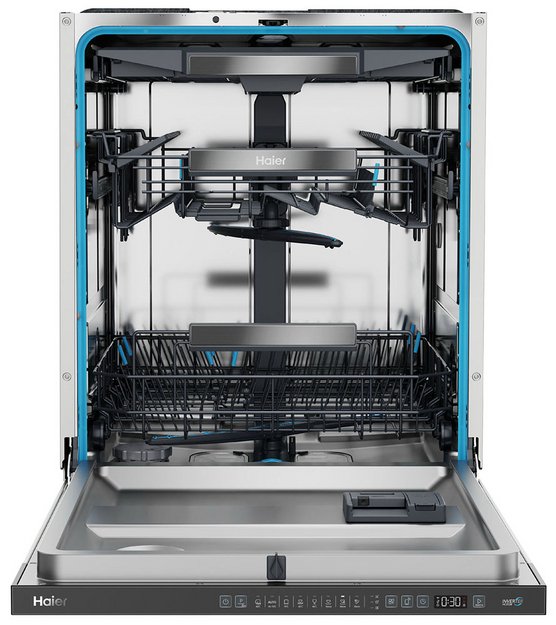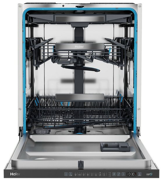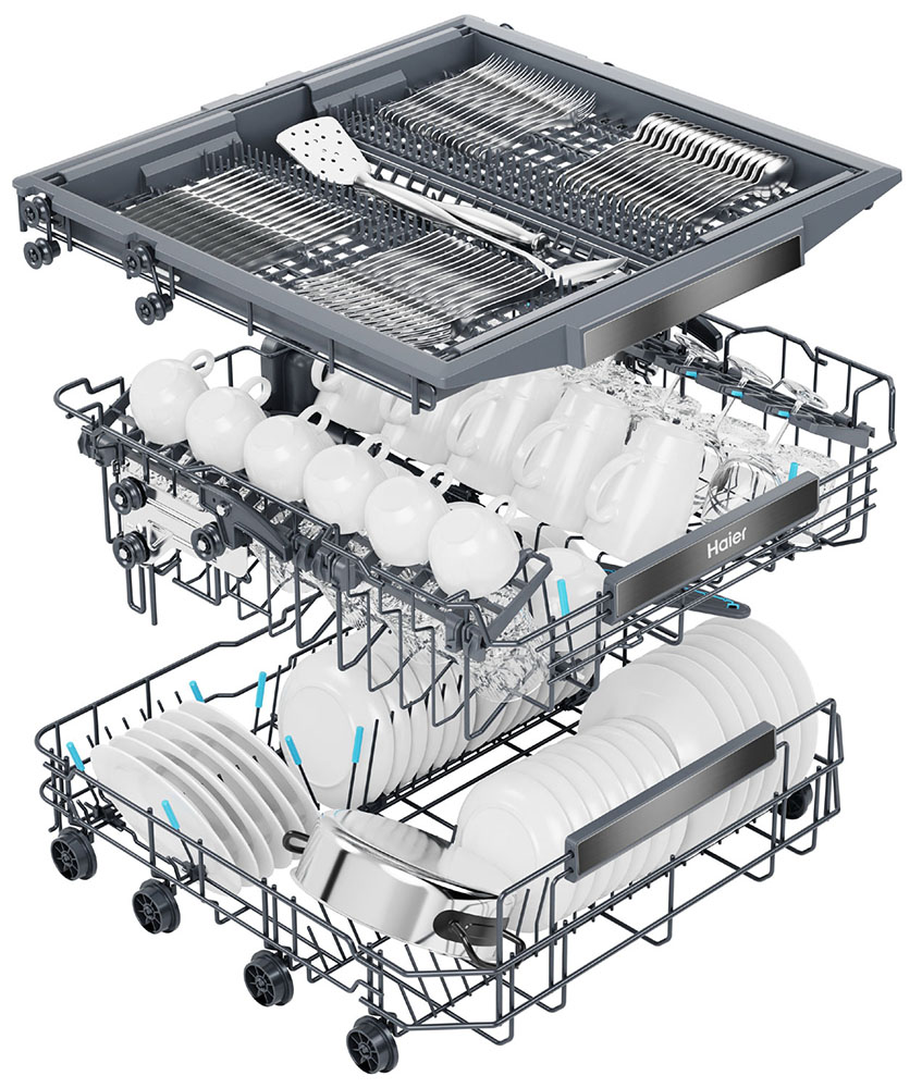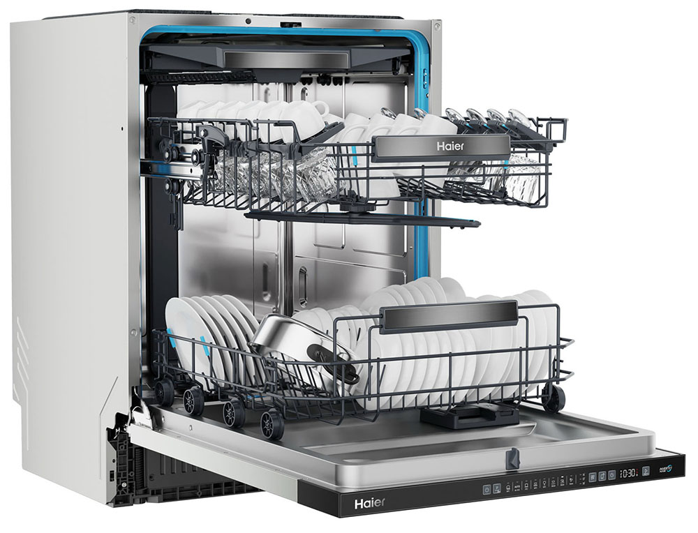 Встраиваемая модель Хайер отлично впишется в любой интерьер, главное — правильно выбрать место, чтобы подвести коммуникации. Устанавливается в нишу целиком, полностью закрывается декоративной панелью. Имеет стандартные размеры, поэтому может не поместиться на очень маленькой кухне. В камеру можно загрузить ограниченное число комплектов: 16 шт. Комплектом считается набор посуды на одного человека, который нужен для полноценного приема пищи: глубокая и плоская тарелки, тарелка для салата, блюдце под чашку, сама чашка, ложка и вилка.