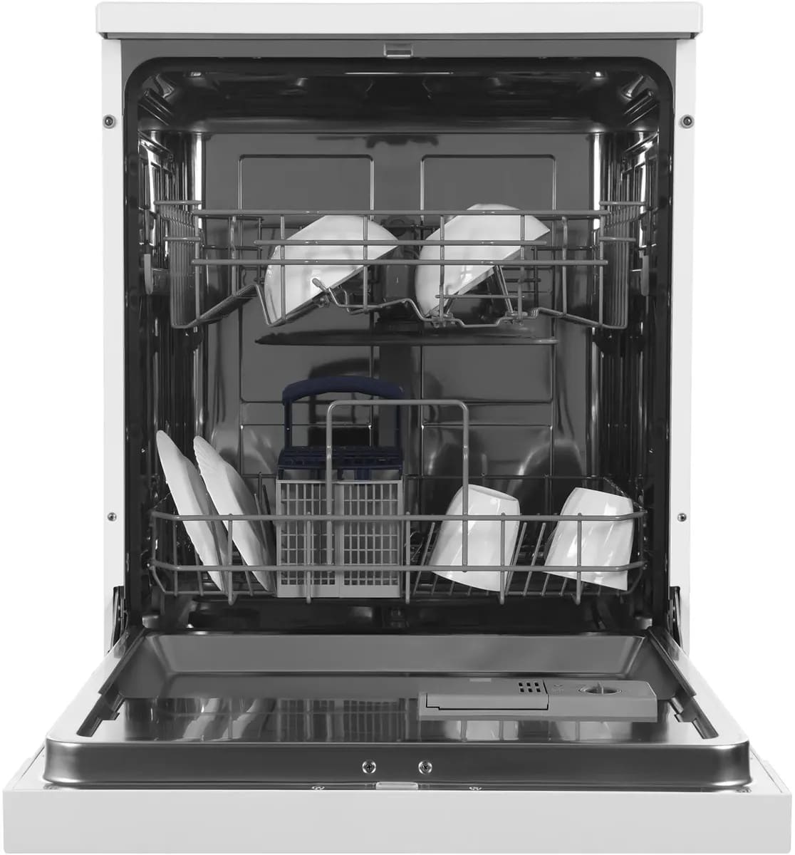 Верхняя корзина может регулироваться по высоте, так что при необходимости в нее можно поместить тарелки большего размера. Нижняя корзина позволяет установить вертикально большие суповые тарелки и блюда большого диаметра — для этого верхнюю корзину можно поднять выше. Тарелки обычно устанавливаются в откидные рамки-держатели, которые легко складываются на дно корзины. Всю посуду в нижней корзине рекомендуется устанавливать без соприкосновения предметов друг с другом, углублением к центру для более интенсивного воздействия струй воды на внутреннюю часть посуды.