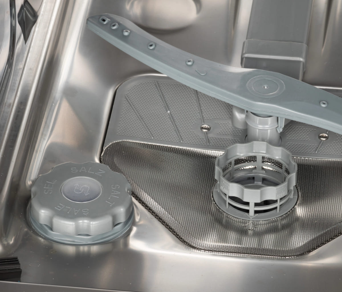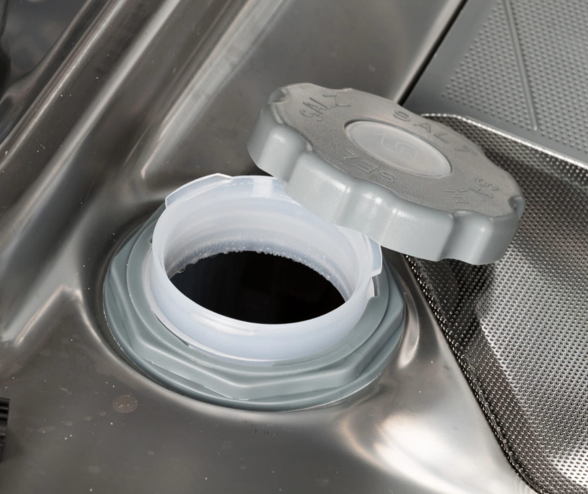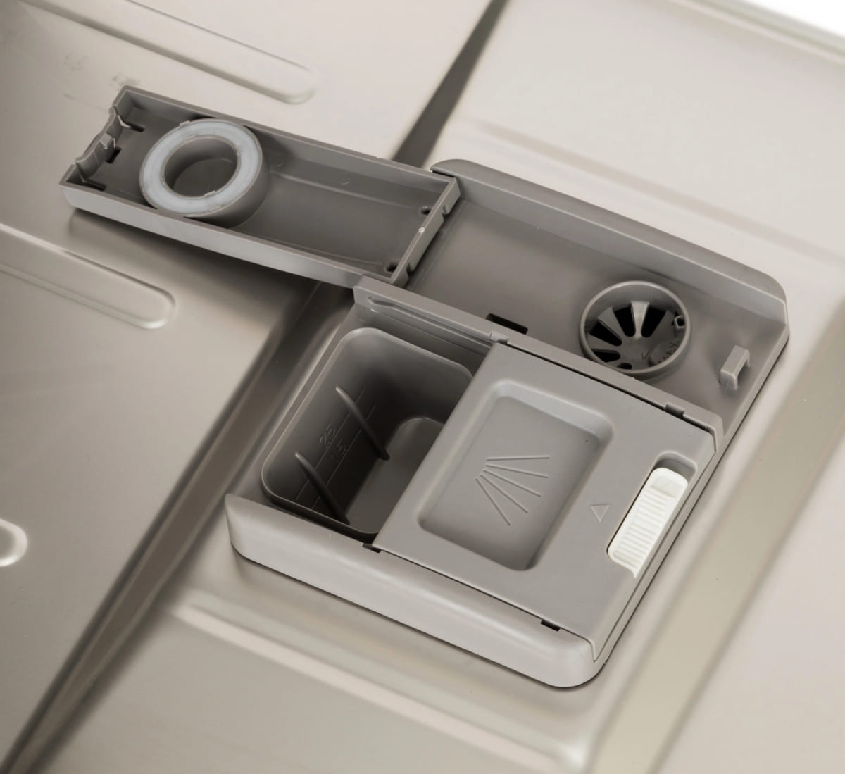 Для качественного мытья требуются три компонента. Порошок служит для удаления загрязнений. Ополаскиватель на последнем этапе рабочего цикла гарантирует скатывание капель воды и придает посуде эффектный блеск. Соль нейтрализует примеси, содержащиеся в жесткой водопроводной воде, и защищает внутренние поверхности и механизм посудомойки от накипи путем смягчения воды. Соль содержит ионы хлора, которые связывают ионы металлов, находящиеся в воде, и не дают им оседать в виде налета. Применение соли необходимо для стабильной работы машины, причем заменять ее обычной поваренной солью не рекомендуется.