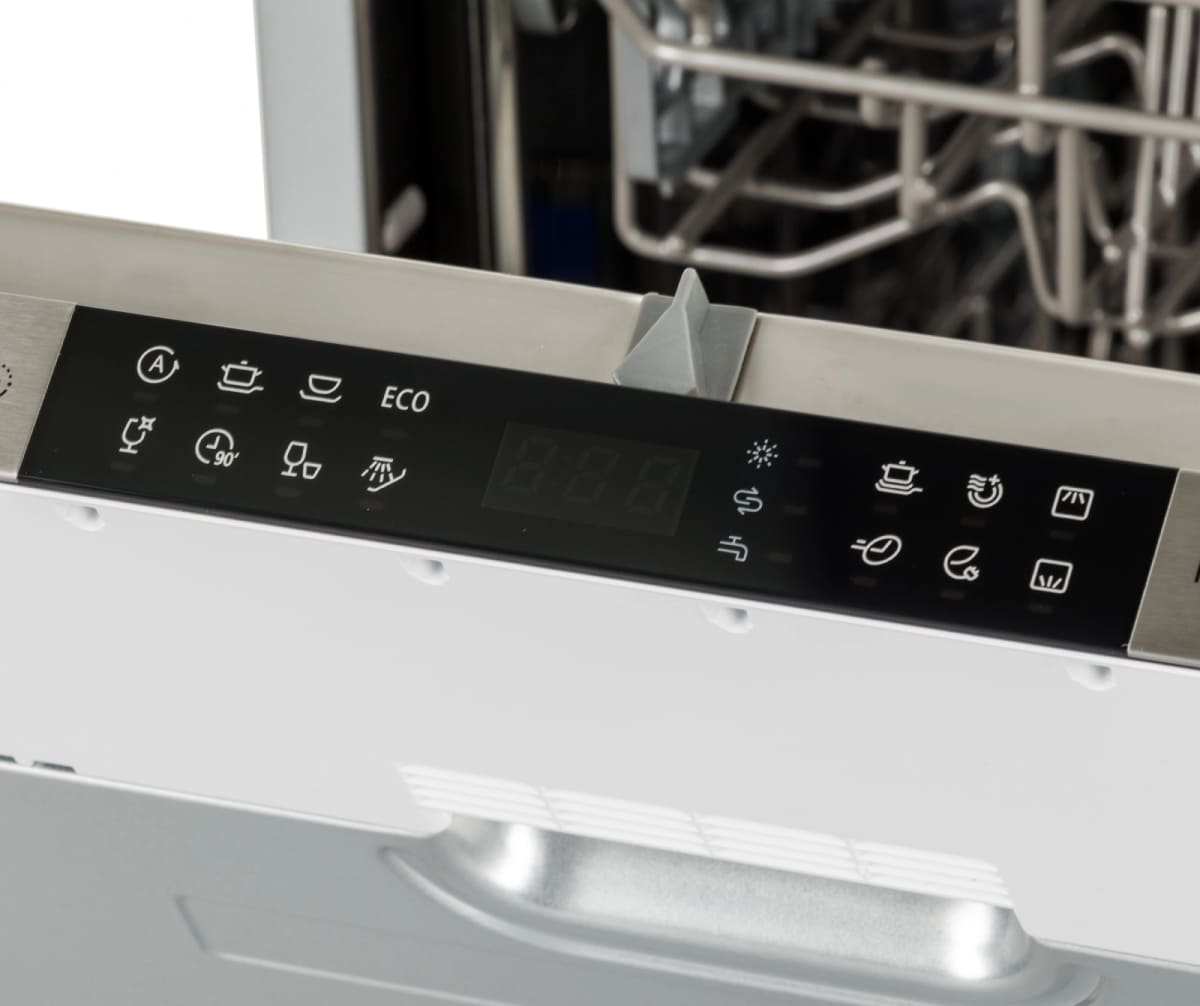Дисплей на сенсорной или кнопочной панели управления посудомоечной машиной позволяет получить информацию о состоянии устройства, а также отрегулировать параметры работы. Во встраиваемых моделях с закрытой панелью управления он будет недоступен на протяжении цикла мытья, в отдельностоящих устройствах может располагаться на фасаде.