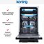 Полностью встроенная модель Кертинг KDI45575 предназначена для установки в кухонную мебель — шкаф, тумбу, нишу. Высота устройства составляет 81,5 см, но благодаря регулируемым ножкам ее можно увеличить до 87,5 см. Ширина 44,8 см и глубина 55 см — стандартные значения для узких посудомоек, так что встраивание не составит труда. Размеры ниши, куда будет установлен прибор, составляют 45 на 58 см. На дверцу навешивается декоративный фасад с жестким креплением в соответствии с общим стилем помещения. На торце двери находится закрытая электронная панель управления серебристого цвета с крупными кнопками и дисплеем белого цвета Cold White.