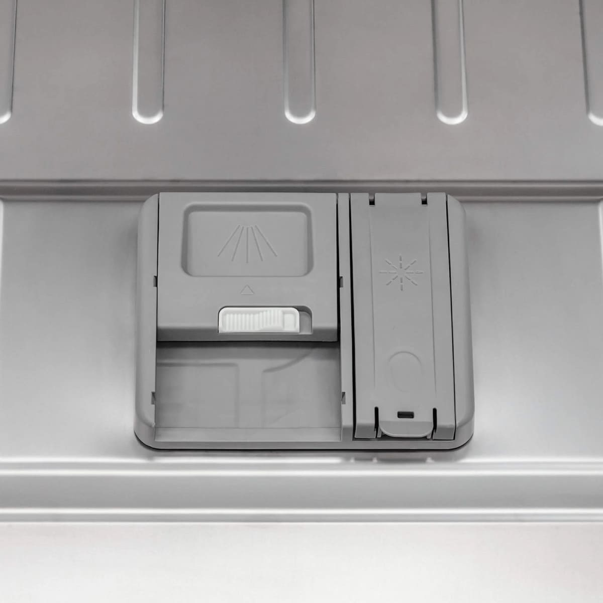 Режим сушки облегчает последующий уход за посудой, предотвращает подтеки на стенках тарелок и бокалов и удаляет значительный процент влаги. Производители внедрили цикл такого типа: конденсационная. Камера выполнена из нержавеющей стали, поэтому служит без проблем, какую бы высокую температуру вы ни включали. Внутри расположены разнообразные датчики, сигналы которых выводятся на панель управления, позволяют вам контролировать процесс. Машинка определяет остаток соли и предупреждает о том, что нужно добавить. Отдельный датчик проверяет наличие ополаскивателя. В модели установлен сенсор чистоты воды, который отправляет данные об уровне мутности — на их основании длительность программы может меняться.