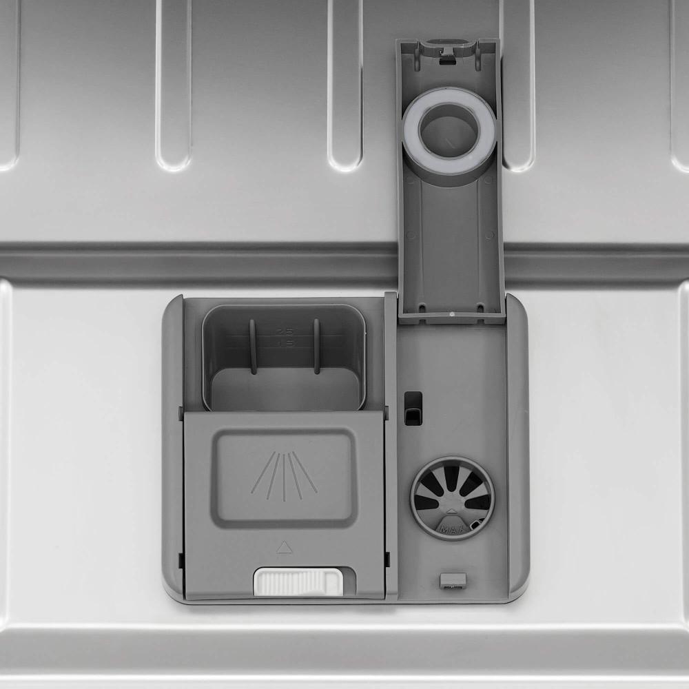 Внутренняя камера выполнена из нержавеющей стали, что повышает стойкость к коррозии и облегчает уход. Вместимость до 14 комплектов посуды и три уровня загрузки дают гибкость при формировании загрузки. Верхняя корзина регулируется по высоте, что позволяет разместить высокие бокалы или крупные тарелки. В комплект входят полка для столовых приборов и стойка для бокалов, а форма S-Type у трех разбрызгивателей обеспечивает равномерное распределение воды по всем ярусам.