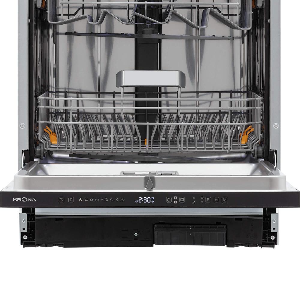Посудомоечная машина Krona Martina 60 BI V2 — полностью встраиваемая полноразмерная модель, созданная для аккуратной интеграции в кухонный гарнитур. Глубина 56 см и стандартная ширина 59,8 см позволяют разместить прибор в большинстве ниш для встраивания. Черная панель управления отлично сочетается с фасадом под навес и остается аккуратной при скрытой установке под дверцей. Жесткое крепление фасада обеспечивает плотное и ровное прилегание дверцы к корпусу, что сохраняет эстетичный вид встроенного модуля.
