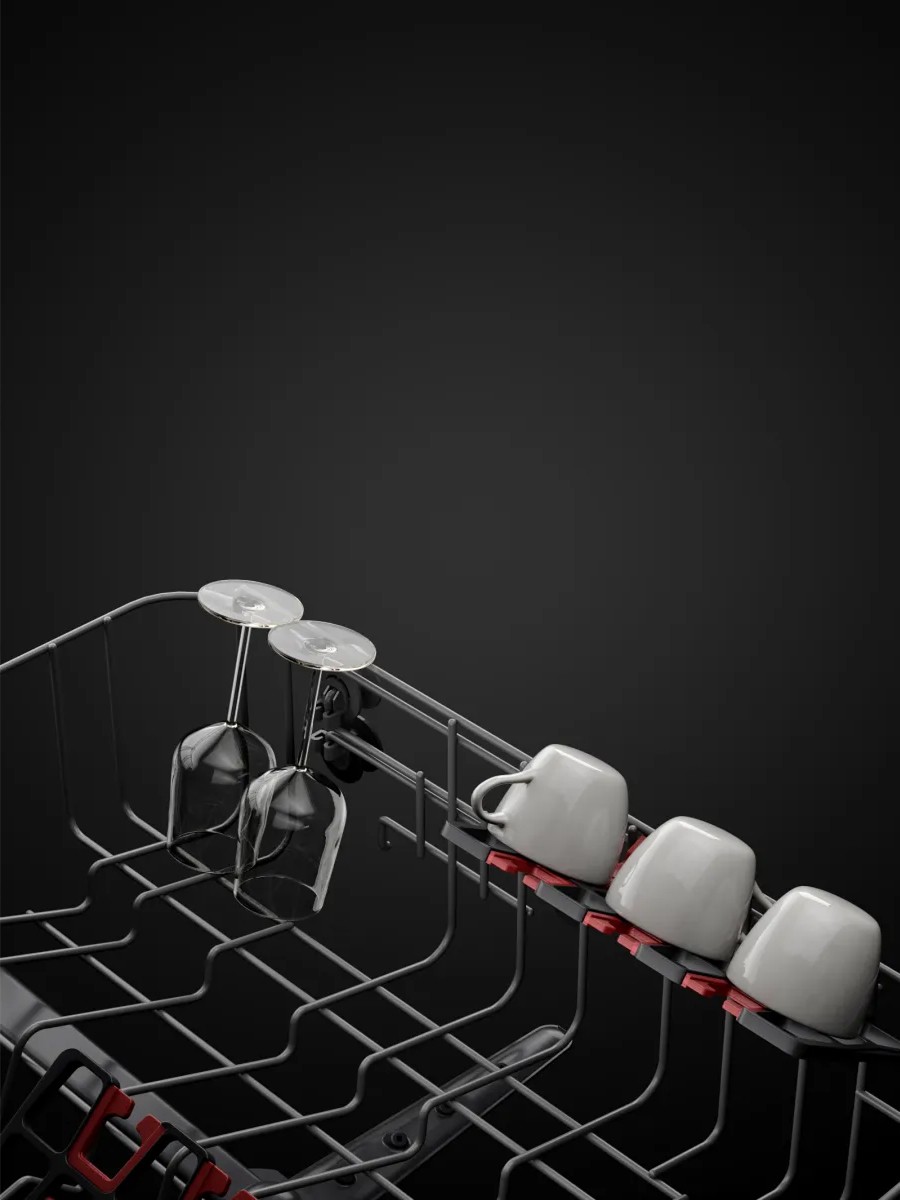 Для размещения чашек, стаканов и бокалов в посудомоечной машине предназначаются различные полки, решетки и подставки. Подобные предметы обычно не нуждаются в особо интенсивном мытье и размещаются в верхней корзине, при этом устанавливать их нужно отверстием вниз. Для небольших кофейных и чайных чашечек предназначаются откидные полки из прочного термостойкого пластика, которые крепятся к боковым сторонам корзины. Как и другие съемные элементы, эти полки выделяются цветом.
