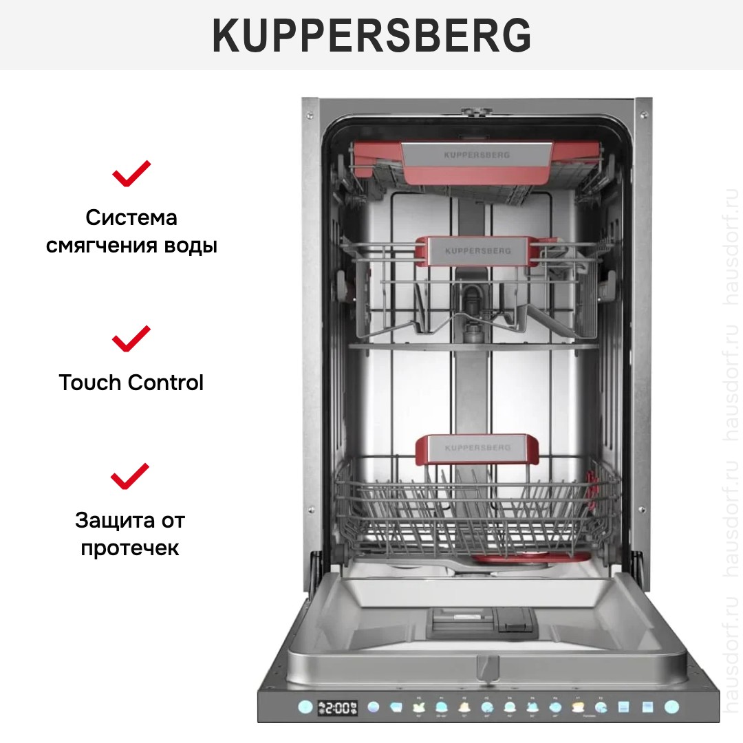 Встраиваемая посудомоечная машина Kuppersberg GIM 4595 создана для тех, кто ценит компактность, надежность и продуманный функционал: при ширине 44.8 см и глубине 55 см она идеально вписывается в узкую нишу 82×45×58 см, занимая высоту 81.5 см и предоставляя при открытой дверце рабочую длину 115 см; корпус рассчитан на полностью встраиваемую установку с слайдерным креплением фасада, что обеспечивает аккуратный внешний вид под навес вашего фасада и серебристую панель управления, скрытую за дверцей для минималистичного интерьера. Дизайн сочетает практичность и технологичность: внутреннее пространство с подсветкой оборудовано регулироваемой по высоте корзиной и полкой для столовых приборов, чашек и тарелок в обоих коробах, а направляющие упрощают загрузку габаритной посуды; установлен инверторный мотор, обеспечивающий тихую работу (44 дБ) и долговечность, а также низкое энергопотребление класса A+++ (156 кВт·ч/год) при максимальной мощности 2100 Вт. Техника предлагает вместимость 10 комплектов и гибкую программу мойки: семь температурных режимов и семь стандартных циклов, среди которых быстрый 58 минут, ночной режим и эталонный Eco 45°C с продолжительностью 225 минут; доступны автоматические варианты, интенсивная и деликатная мойка, а также гигиеническая опция для тщательного обеззараживания. Система сушки конденсационная в сочетании с классом сушки A и дополнительной функцией «Экстра-сушка» обеспечивает сухость даже у сложных предметов, а совместимость со средствами 3 в 1 и наличие системы смягчения воды облегчают уход и улучшают результат. Управление полностью электронное: закрытая панель с LED-дисплеем и сенсорными элементами, кнопки Вкл./Выкл. и выбора программ, таймер отсрочки 1-24 часа, а также индикация уровня соли и ополаскивателя, сигнал окончания в виде светового уведомления и фирменный «луч на полу» помогают контролировать процесс без лишних действий. Надежность дополнена полной защитой от протечек, автоматическим отключением, регулируемыми ножками и плавным открытием/закрытием дверцы; предусмотрена функция самоочистки фильтра и съемные распылители, в том числе дополнительный Plus Wash для улучшенной обработки сложных загрязнений. Эксплуатационные показатели впечатляют экономичностью: расход воды на цикл всего 8 л (годовой объем 2240 л), энергозатраты на цикл 0.546 кВт·ч, компактный брутто-вес 39.2 кг и базовая комплектация — воронка для соли, монтажный комплект, заливной и сливной шланги — упрощают монтаж и обслуживание. Дополнительные возможности включают автооткрытие дверцы по окончании программы для естественной сушки, настройку дозировки ополаскивателя и индикатор отсутствия воды, а фильтр и полнофункциональные коромысла гарантируют стабильный результат. Этот аппарат рассчитан на стандартную сеть 220-240 В, 50 Гц и обеспечит удобство ежедневного использования благодаря эргономичным корзинам, простому доступу к пятнам и экономичным режимам, совмещая компактность, высокий класс мойки A и современный функционал от Kuppersberg; артикул 8580.