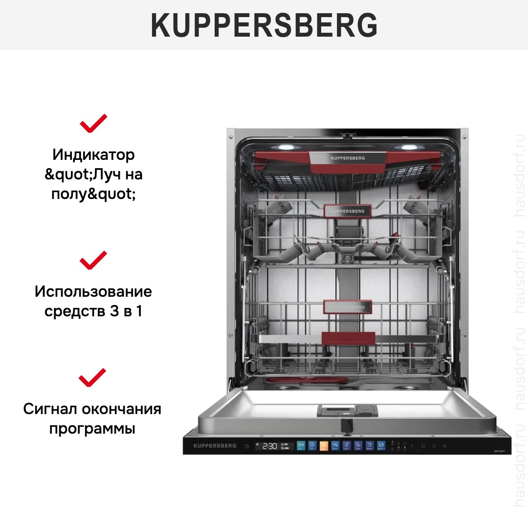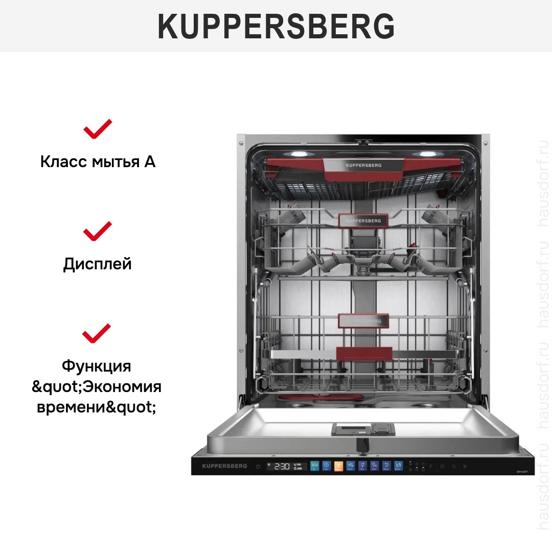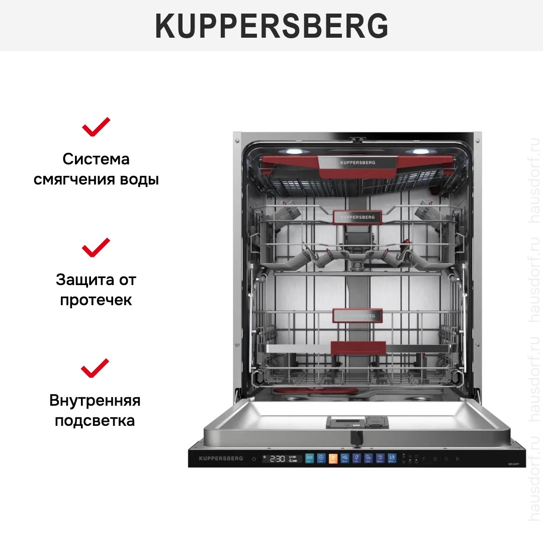 Встраиваемая посудомоечная машина Kuppersberg GIM 6097 создаёт впечатление утончённого и продуманного решения для современной кухни: полностью встраиваемый корпус идеально прячется под фасадом, оставляя только скрытую чёрную панель управления, что позволяет сохранить целостность интерьера и минималистичную эстетику мебели. Элегантность внешнего вида сочетается с продуманной практичностью: компактные габариты 81.5×59.8×55 см при глубине с открытой дверью 118.5 см дают возможность установки в стандартную нишу 82×60×58 см, а высота и регулируемые ножки упрощают монтаж и подгонку по уровню. Внутреннее пространство рассчитано на 14 комплектов посуды и оснащено регулируемой по высоте корзиной, удобной нижней корзиной Comfort Up и универсальной системой WidFlex, обеспечивающей гибкую загрузку тарелок, чашек и столовых приборов; для мелочей предусмотрена полка для столовых приборов и дополнительная полочка для чашек в верхнем коробе, а направляющие для тарелок расположены в обоих ярусах. Техника оснащена инверторным мотором, который обеспечивает тихую и экономичную работу при уровне шума всего 44 дБ, а класс энергопотребления A+++ и расход электроэнергии 0.645 кВт·ч за цикл гарантируют низкие эксплуатационные расходы; при этом расход воды составляет всего 9.5 л за цикл, что позволяет существенно экономить ресурсы. Для гибкого управления предложено электронное управление с закрытой панелью и LED-дисплеем, кнопками включения и выбора программ, таймером отсрочки запуска от 1 до 24 часов и индикаторами наличия ополаскивателя и соли; в набор сигналов входят звуковой и световой оповещатели, луч на полу информирует о завершении работы, а также предусмотрены индикаторы контроля закрытого крана, уровня потребления воды и энергопотребления, что делает эксплуатацию удобной и предсказуемой. Функциональность включает 8 температурных режимов и столько же стандартных программ, среди которых быстрый цикл на 58 минут и ночной режим; доступны гигиеническая программа, автоматические циклы, интенсивная и деликатная мойка, при этом эталонный цикл Eco 45°C длится 220 минут. Сушка конденсационная с классом A обеспечивает качественный результат, а дополнительная опция экстра-сушки повышает эффективность сушки фарфора и пластиковых элементов. Практичные функции включают режим экономии времени, самоочистку и экологичный режим, систему смягчения воды, использование средств 3 в 1 и встроенный фильтр, что облегчает уход и продлевает срок службы агрегата. Для улучшения качества полоскания предусмотрены дополнительные разбрызгиватели Plus Wash и съёмные форсунки, есть настройка дозировки ополаскивателя и регулировка расхода соли; моечные элементы расположены так, чтобы обеспечить мойку в любой корзине, а верхний распылитель и продуманные коромысла гарантируют равномерное распределение воды. Комплект поставки включает монтажный комплект, заливной и сливной шланги и воронку для соли, что облегчает подключение; безопасность обеспечивает полная защита от протечек и автоматическое отключение. Встроенная подсветка внутреннего объёма облегчает загрузку в сумерках, а функция автоматического открытия дверцы в конце цикла помогает снижать влажность и способствует лучшему высыханию. Технические параметры подчёркивают надёжность: максимальная температура 72°C, максимальная потр