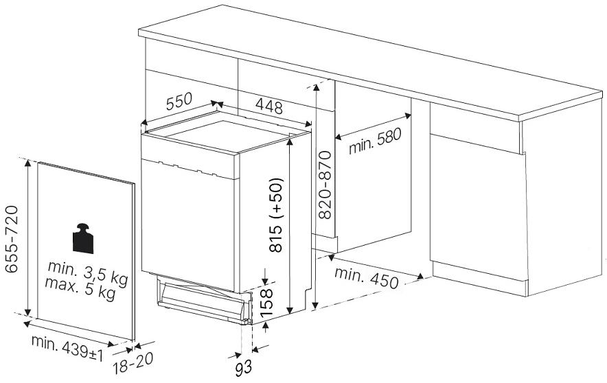 Встраиваемые устройства устанавливаются в тумбу или нишу мебельного гарнитура. В случае, если они полностью закрыты мебельным фасадом, машины считаются полностью встраиваемыми. Такое размещение позволяет сохранить единый стиль интерьера. Панель управления их также скрыта — чтобы начать работу и задать программу, дверцу придется открыть.
