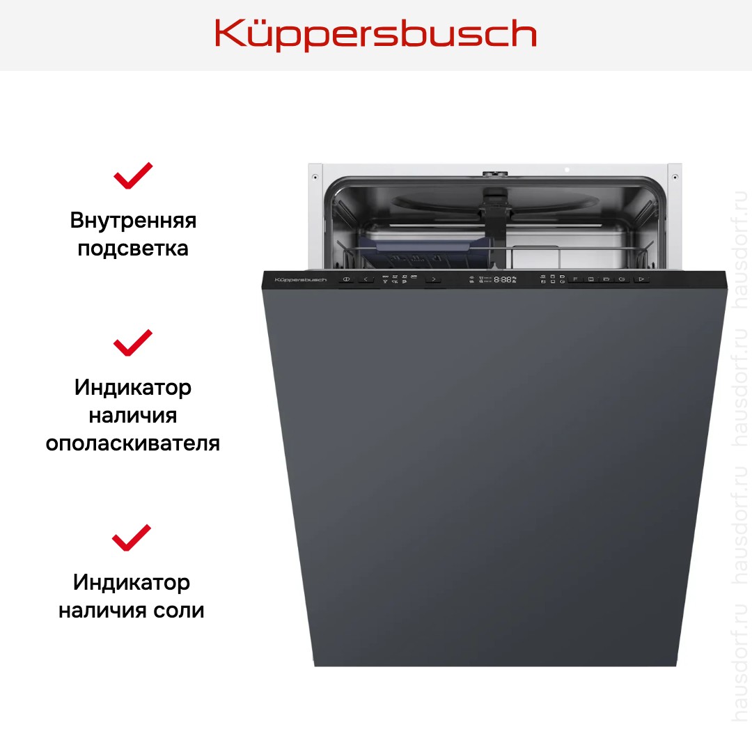 Встраиваемая модель Куперсбуш отлично впишется в любой интерьер, главное — правильно выбрать место, чтобы подвести коммуникации. Устанавливается в нишу целиком, полностью закрывается декоративной панелью. Обратите внимание: в комплекте не идет фасад, его необходимо установить самостоятельно. Имеет стандартные размеры, поэтому может не поместиться на очень маленькой кухне. В камеру можно загрузить ограниченное число комплектов: 14 шт. Комплектом считается набор посуды на одного человека, который нужен для полноценного приема пищи: глубокая и плоская тарелки, тарелка для салата, блюдце под чашку, сама чашка, ложка и вилка.