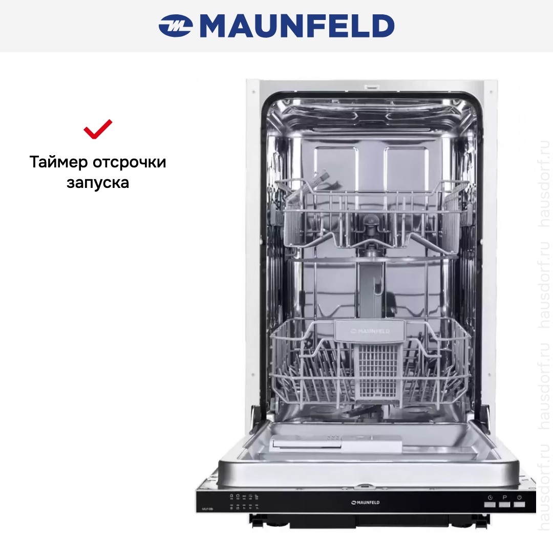 В базовую комплектацию посудомоечной машины входят сливной и заливной шланг, воронка для соли и держатель для шланга. Отдельно можно приобрести дополнительные аксессуары — подставку для столовых приборов, держатель для стаканов и т.д. Машинка MAUNFELD MLP08I является довольно узкой по сравнению с аналогами, ее ширина составляет всего лишь 44,8 см, что позволяет расположить ее в сравнительно небольшой нише.