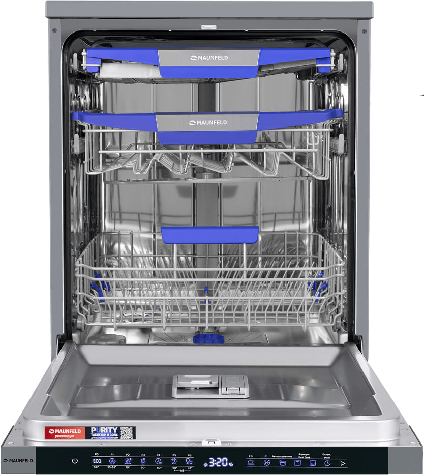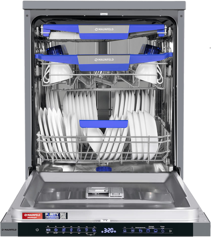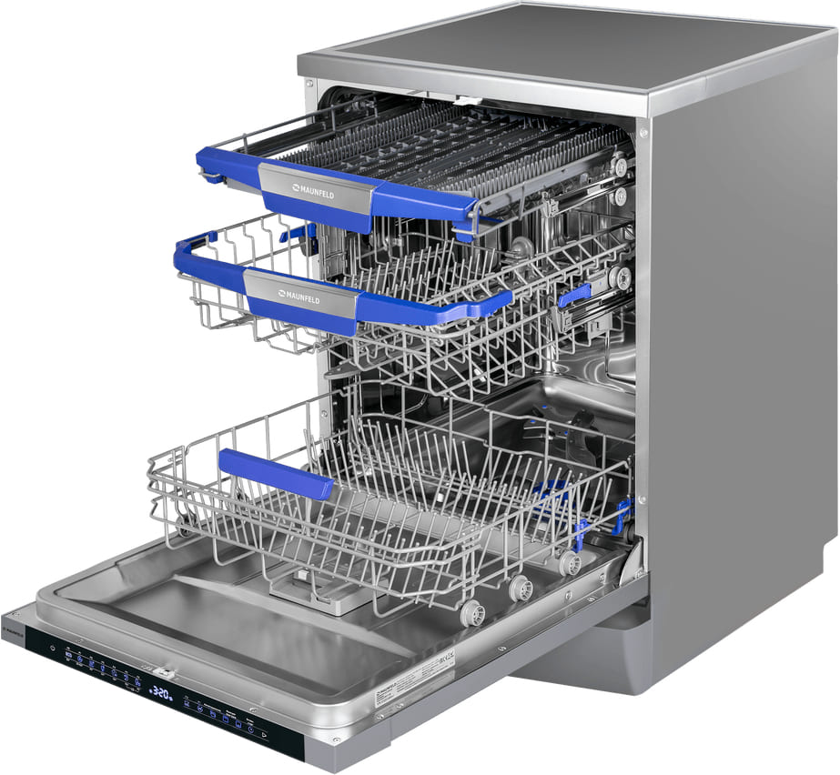 Посудомоечная машина Maunfeld MWF60331S Inverter — это продуманное сочетание сдержанного дизайна и практичных решений для современной кухни. Корпус из нержавеющей стали и черная открытая панель управления придают прибору премиальный вид, легко интегрируемый в интерьер как встраиваемой техники, так и отдельно стоящей установки — высота 84.5 см при стандартной ширине 59.8 см и глубине 60 см обеспечивает удобство размещения в кухонном пространстве, а с открытой дверцей глубина увеличивается до 117.5 см, что важно учитывать при планировке. Вместимость до 14 комплектов позволяет обслуживать большую семью или небольшой офис, а регулировка высоты верхней корзины и возможность мойки в любой из них обеспечивают гибкость при загрузке посуды различного размера: есть направляющие в нижнем отсеке и полочка для чашек в верхнем, а отдельная полка для столовых приборов делает хранение приборов аккуратным и безопасным. Устройство оснащено инверторным мотором, что снижает энергопотребление и уровень шума — всего 42 дБ — при этом обеспечивая стабильную работу и долговечность узлов. За сушку отвечает конденсационный режим класса A, который вместе с энергоэффективностью A+++ и экономичным расходом воды — 10 л за цикл — делает эксплуатацию выгодной и экологичной: годовой расход электроэнергии составляет 184 кВт·ч, годовой расход воды — 2744 л. Набор программ богат: 8 стандартных режимов покрывают все типичные сценарии — от деликатной и быстрой до интенсивной и ночной мойки; есть автоматические опции, гигиеническая программа и режим для слабозагрязненной посуды. Управление электронное с цифровым дисплеем и сенсорной панелью Touch Control позволяет точно выбирать параметры, таймер отсрочки старта на 1-24 часа дает возможность запускать цикл в удобное время, а индикация наличия ополаскивателя и соли, звуковой сигнал окончания и индикатор отсутствия подачи воды облегчают эксплуатацию. Среди дополнительных функций стоит выделить экономию времени, функцию самоочистки и совместимость со средствами 3 в 1. В комплекте идут заливной и сливной шланги длиной 1,4 м, предусмотрена система смягчения воды с регулировкой, фильтр, защита от протечек и сервисная диагностика, а автоматическое открытие дверцы по завершении цикла улучшает сушку и предотвращает образование запахов. Конструктивно прибор оснащен регулируемыми ножками, автоматическим отключением и рассчитан на стандартное напряжение 220-240 В при частоте 50 Гц, максимальная потребляемая мощность — 2100 Вт, максимальная температура нагрева — до 70 °C. Эта модель выигрышно выглядит на кухне благодаря лаконичным линиям и качественным материалам, при этом выделяется практичностью: удобные корзины, многофункциональная панель и экономичность в эксплуатации делают её оптимальным выбором для тех, кто ценит сочетание стиля, надежности и современных технологий.