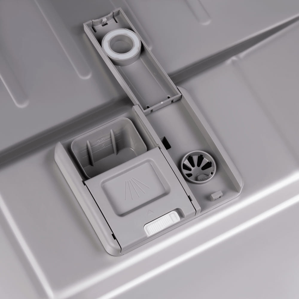 Для качественного мытья требуются три компонента. Порошок служит для удаления загрязнений. Ополаскиватель на последнем этапе рабочего цикла гарантирует скатывание капель воды и придает посуде эффектный блеск. Соль нейтрализует примеси, содержащиеся в жесткой водопроводной воде, и защищает внутренние поверхности и механизм посудомойки от накипи путем смягчения воды. Соль содержит ионы хлора, которые связывают ионы металлов, находящиеся в воде, и не дают им оседать в виде налета. Применение соли необходимо для стабильной работы машины, причем заменять ее обычной поваренной солью не рекомендуется.