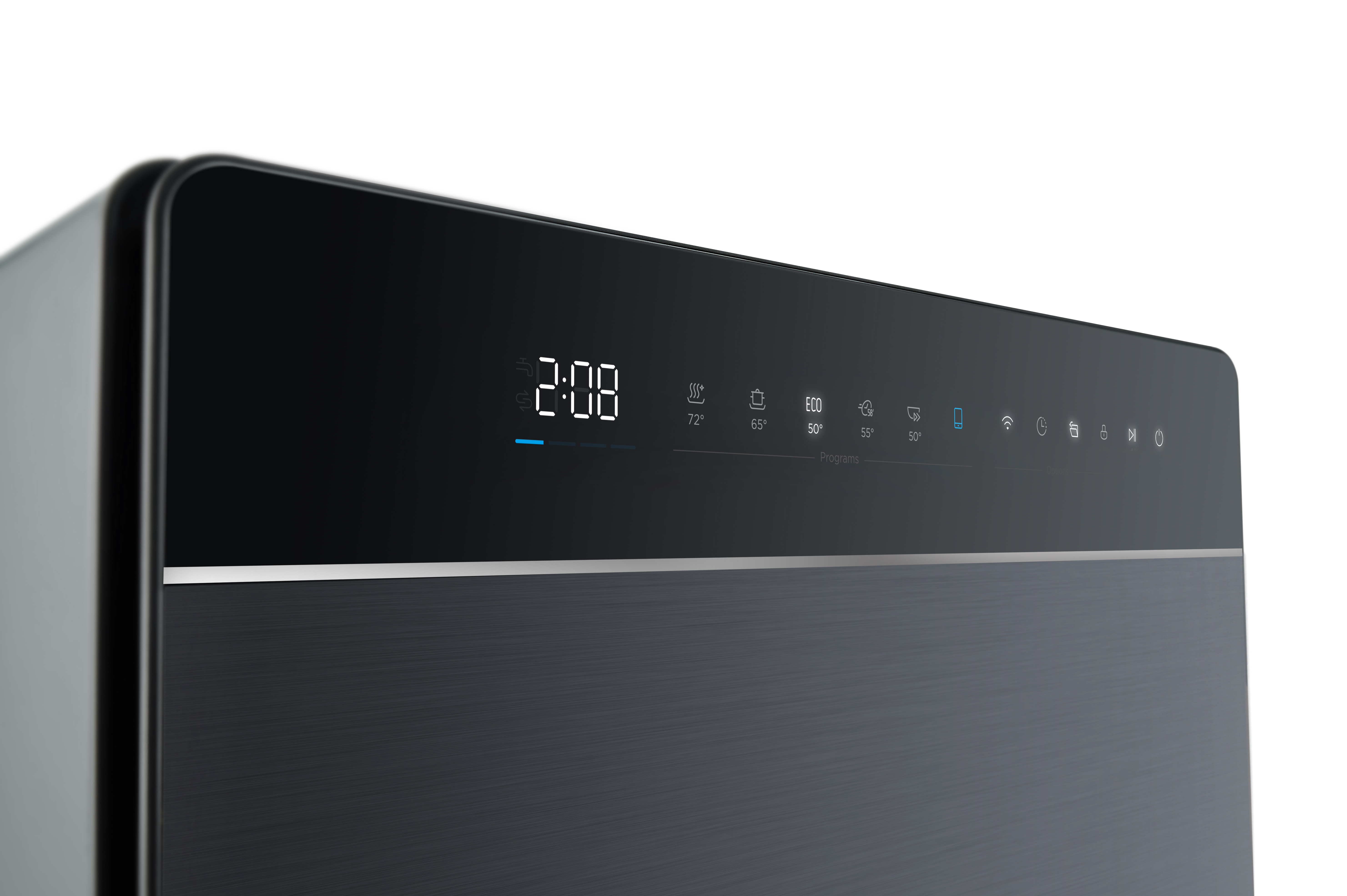 Цвет панели управления посудомоечной машины во многом зависит от типа устройства и расположения управляющих элементов. В большинстве современных посудомоек используется кнопочное либо сенсорное управление. В отдельностоящих и настольных моделях панель управления может быть открытой и располагаться на фронтальной части прибора, что облегчает установку параметров работы и контроль за выполнением программы. Во встраиваемых моделях с возможностью навески декоративного мебельного фасада панель управления чаще всего размещается на верхней кромке дверцы.