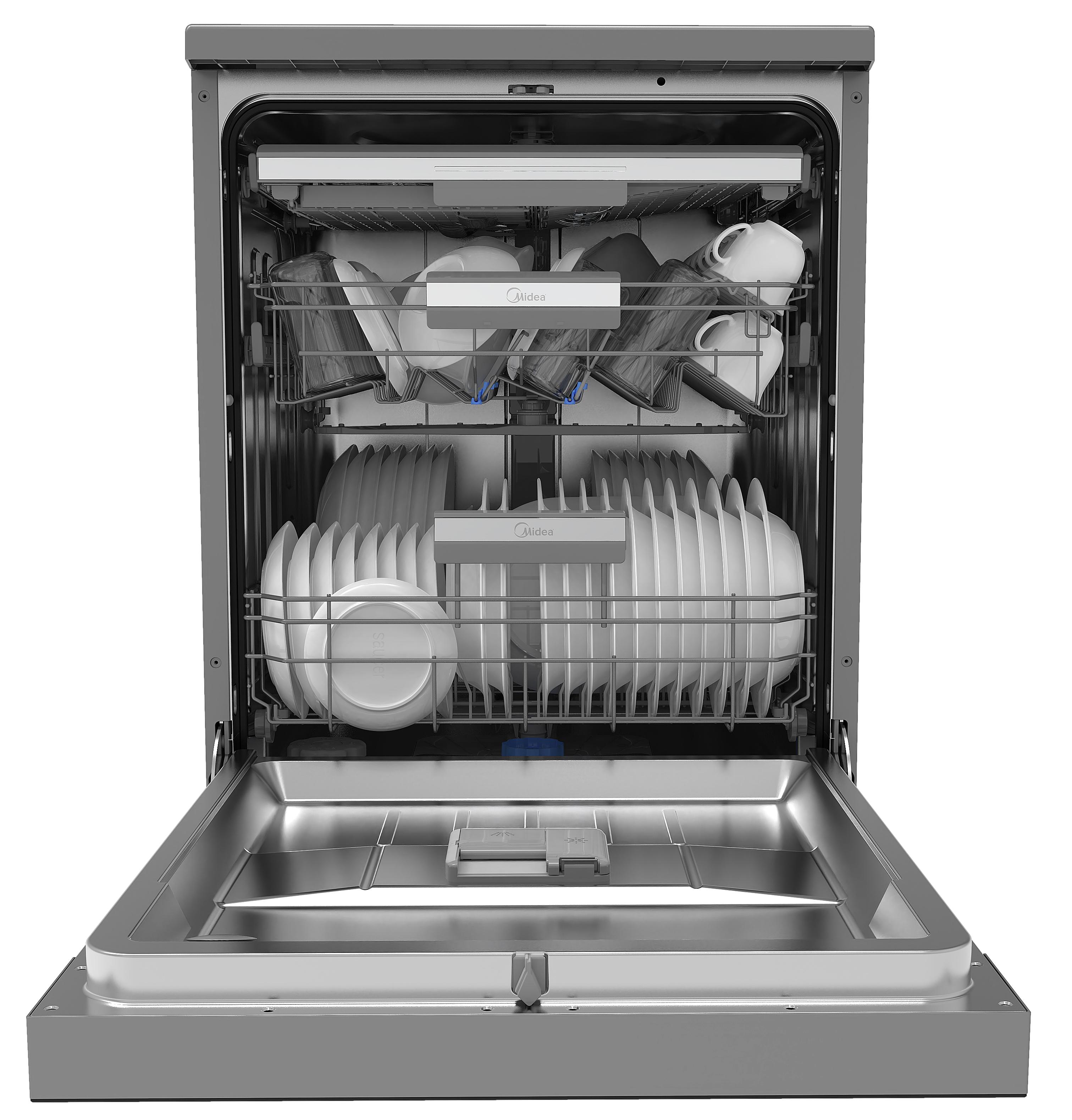 Отдельностоящая модель Мидеа отлично впишется в кухонный интерьер, главное — правильно выбрать место, чтобы подвести коммуникации. Имеет стандартные размеры, поэтому может не поместиться на очень маленькой кухне. В камеру можно загрузить ограниченное число комплектов: 14 шт. Комплектом считается набор посуды на одного человека, который нужен для полноценного приема пищи: глубокая и плоская тарелки, тарелка для салата, блюдце под чашку, сама чашка, ложка и вилка.