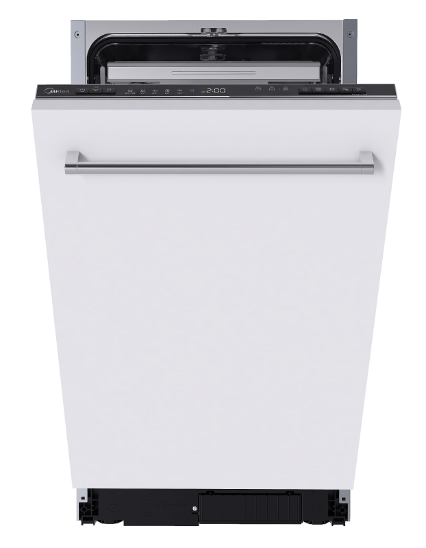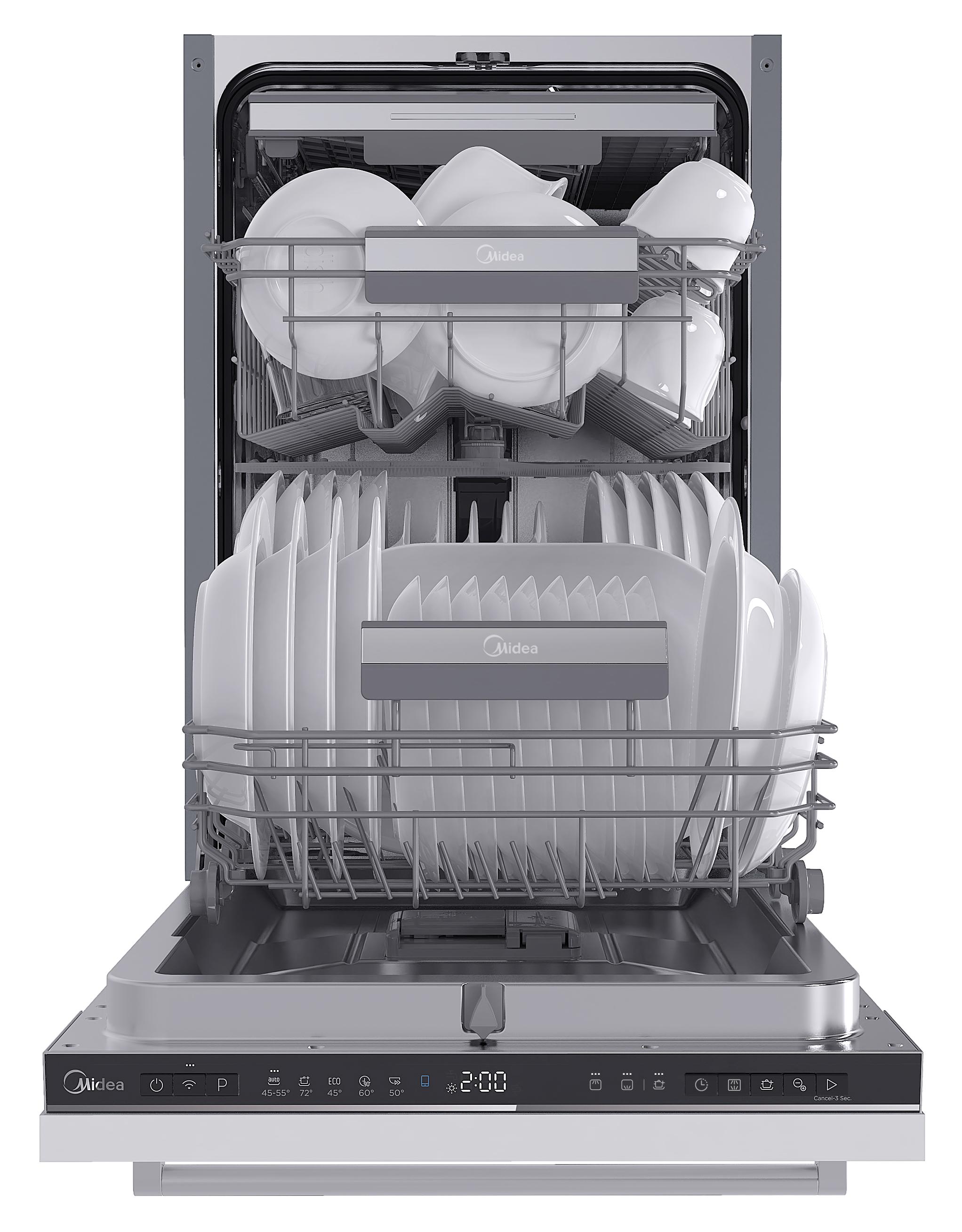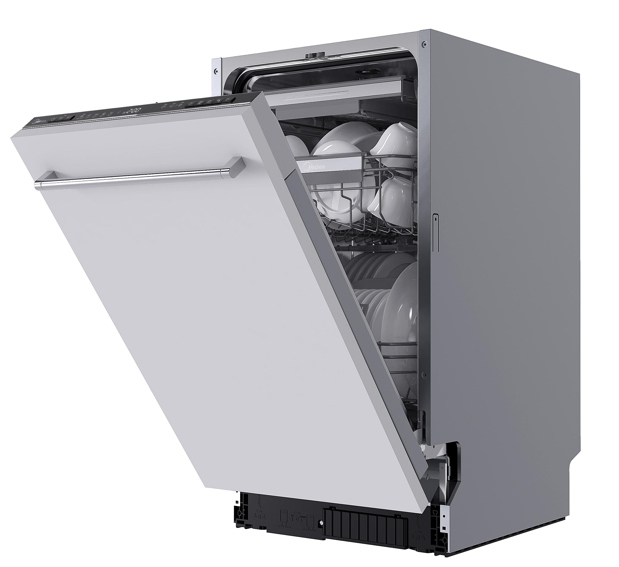 Встраиваемая модель Мидеа отлично впишется в любой интерьер, главное — правильно выбрать место, чтобы подвести коммуникации. Устанавливается в нишу целиком, полностью закрывается декоративной панелью. Обратите внимание: в комплекте не идет фасад, его необходимо установить самостоятельно. Имеет уменьшенную ширину — благодаря этому поместится даже на очень маленькой кухне. В камеру можно загрузить ограниченное число комплектов: 10 шт. Комплектом считается набор посуды на одного человека, который нужен для полноценного приема пищи: глубокая и плоская тарелки, тарелка для салата, блюдце под чашку, сама чашка, ложка и вилка.