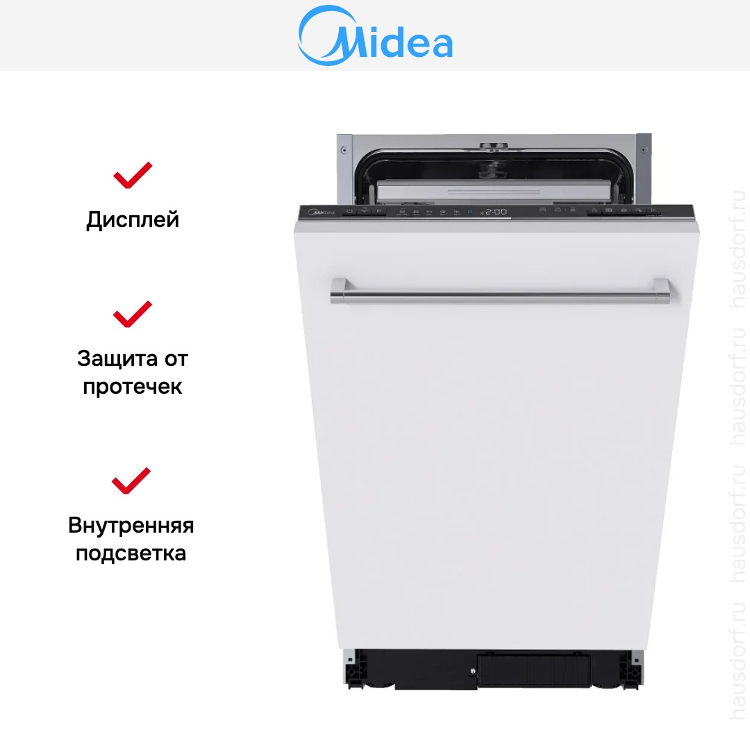 Посудомоечная машина Midea MID45S350I представляет собой полностью встраиваемое решение для компактной кухни. Ее узкий корпус шириной 44.8 см и глубиной 55 см позволяет установить прибор в ниши стандартного размера. Габариты 81.5×44.8×55 см и рекомендуемая ниша 81.5-87.5×45×55 см обеспечивают максимально плотную интеграцию под столешницу. Фасад прячется под вашим навесом, а черная закрытая панель управления остается аккуратно скрытой, сохраняя единую линию кухонного гарнитура. Внутренняя подсветка упрощает загрузку в сумерках и позволяет сразу видеть расположение посуды.