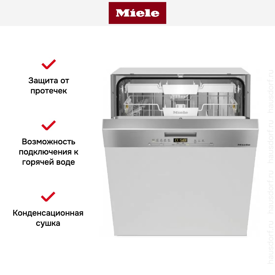 Встраиваемая посудомоечная машина Miele G 5000 SCi обладает безопасной системой защиты от протечек Waterproof. Программа автоматически срабатывает в случае, когда произошли какие-либо аварийные ситуации или при неплотно закрытой дверце. Технология EcoPower уменьшает расход воды до 8,9 литров. Также, при нагреве воды тратиться гораздо меньше электроэнергии. Функция отложенного старта дает возможность установить желаемое время начало работы даже через 24 часа.