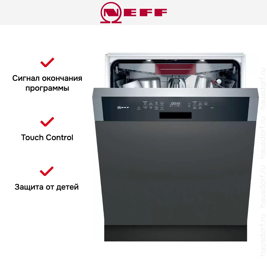 Встраиваемая модель Нефф отлично впишется в любой интерьер, главное — правильно выбрать место, чтобы подвести коммуникации. Устанавливается в нишу целиком, полностью закрывается декоративной панелью. Обратите внимание: в комплекте не идет фасад, его необходимо установить самостоятельно. Имеет стандартные размеры, поэтому может не поместиться на очень маленькой кухне. В камеру можно загрузить ограниченное число комплектов: 14 шт. Комплектом считается набор посуды на одного человека, который нужен для полноценного приема пищи: глубокая и плоская тарелки, тарелка для салата, блюдце под чашку, сама чашка, ложка и вилка.