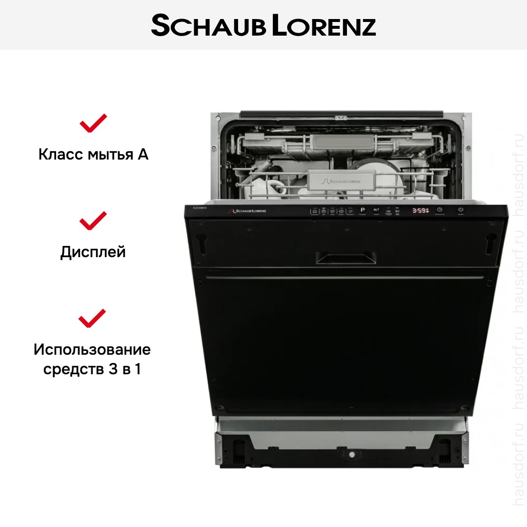 Встраиваемая модель Шауб Лоренц отлично впишется в любой интерьер, главное — правильно выбрать место, чтобы подвести коммуникации. Устанавливается в нишу целиком, полностью закрывается декоративной панелью. Обратите внимание: в комплекте не идет фасад, его необходимо установить самостоятельно. Имеет стандартные размеры, поэтому может не поместиться на очень маленькой кухне. В камеру можно загрузить ограниченное число комплектов: 14 шт. Комплектом считается набор посуды на одного человека, который нужен для полноценного приема пищи: глубокая и плоская тарелки, тарелка для салата, блюдце под чашку, сама чашка, ложка и вилка.