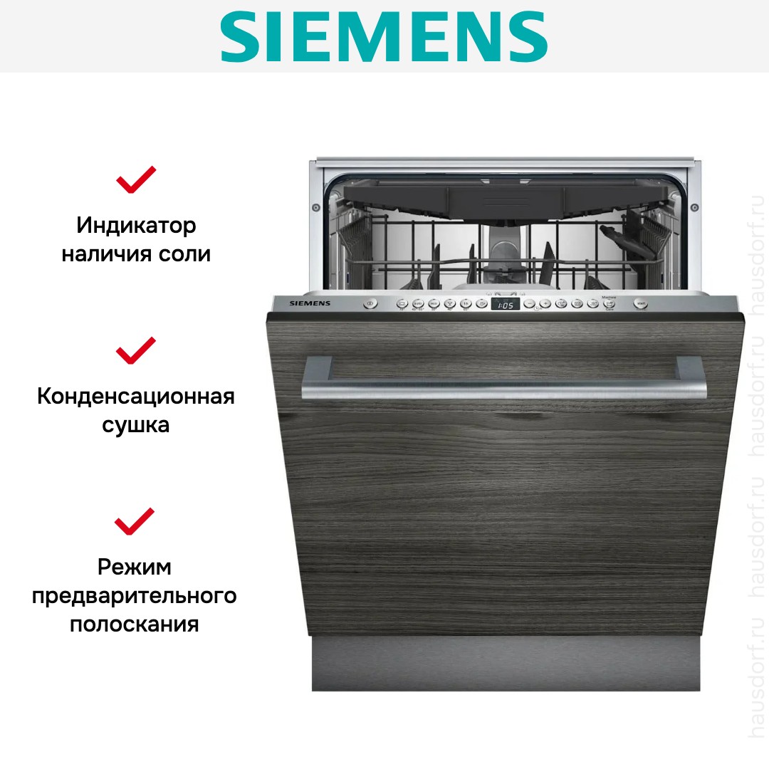 Встраиваемая модель Сименс отлично впишется в любой интерьер, главное — правильно выбрать место, чтобы подвести коммуникации. Устанавливается в нишу целиком, полностью закрывается декоративной панелью. Обратите внимание: в комплекте не идет фасад, его необходимо установить самостоятельно. Имеет стандартные размеры, поэтому может не поместиться на очень маленькой кухне. В камеру можно загрузить ограниченное число комплектов: 13 шт. Комплектом считается набор посуды на одного человека, который нужен для полноценного приема пищи: глубокая и плоская тарелки, тарелка для салата, блюдце под чашку, сама чашка, ложка и вилка.