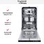 Узкие посудомоечные машины отличает ширина от 44,5 до 45 см при стандартных высоте и глубине и, соответственно, меньшая вместимость, не превышающая 10 комплектов посуды. Обычно это приборы встраиваемого типа, которые легко устанавливаются в узкую мебельную тумбу. Компактные устройства значительно меньше полноразмерных по высоте, а по своей ширине практически от них не отличаются — она составляет от 55 до 60 см. Вместимость подобных небольших машин встраиваемого и отдельно стоящего типа — 4-6 комплектов посуды.
