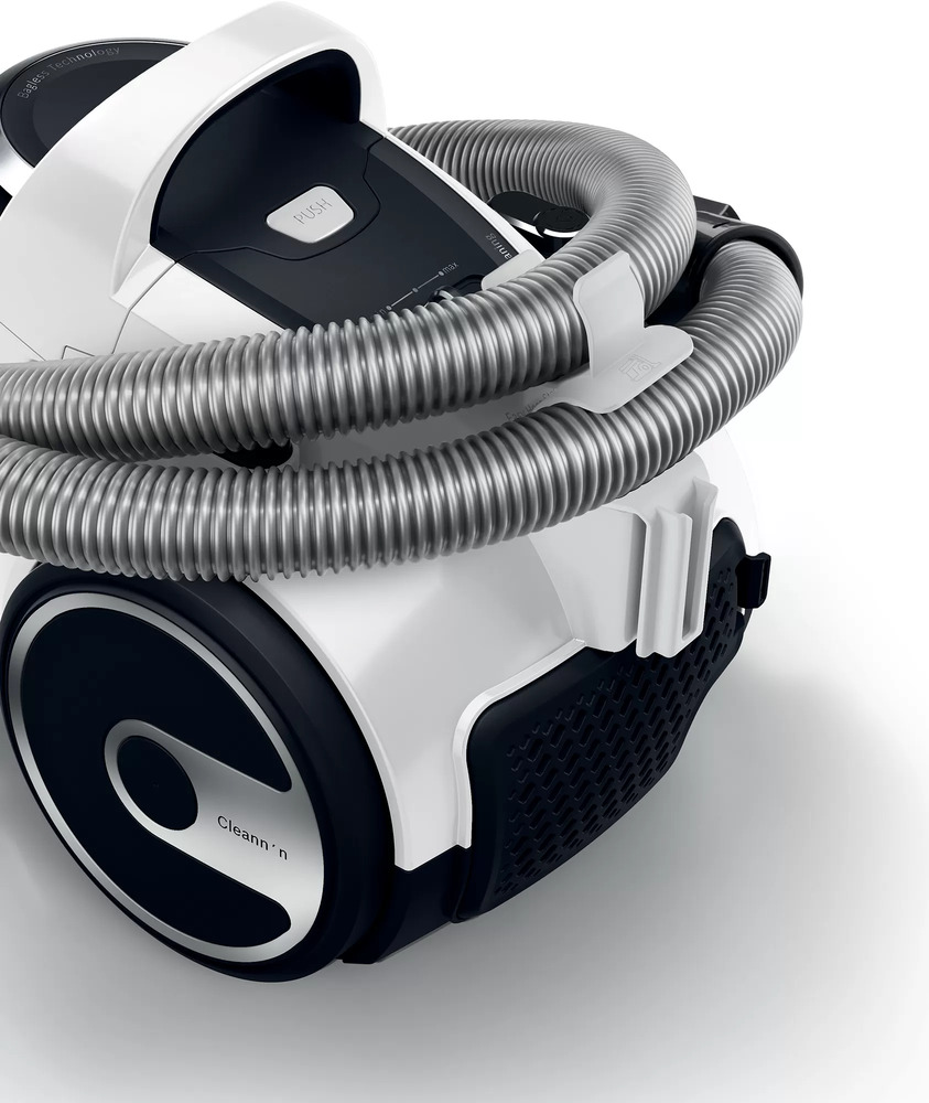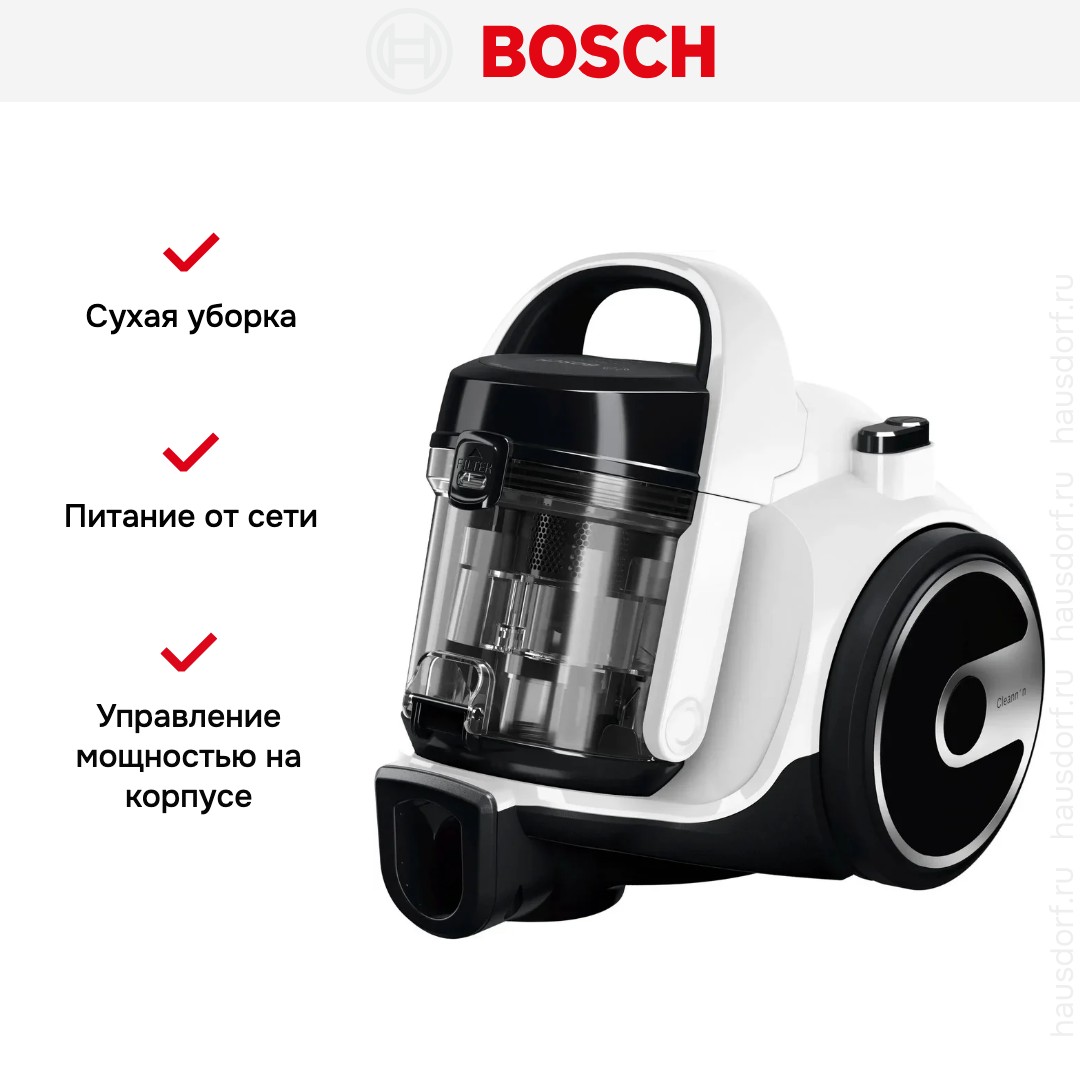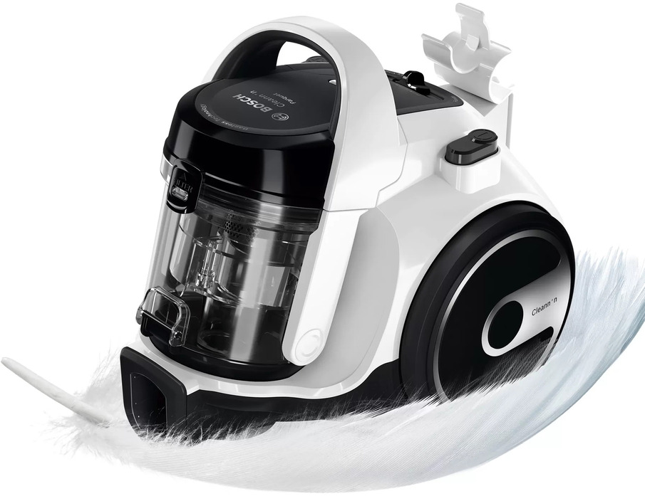 Пылесос Bosch BGS05A222 имеет стандартную конфигурацию — корпус на колесах, крепящийся к нему шланг с трубками-удлинителями и насадками. Данная модель рассчитана только на сухую уборку, которой достаточно для большинства пользователей. Мощный поток воздуха позволяет быстро всасывать как мелкие, так и крупные частицы, волосы и шерсть. Основной цвет прибора — белый. В качестве пылесборника производитель установил стандартный контейнер. Пользоваться им легко и удобно: чтобы очистить, просто достаньте его и высыпьте все в мусорное ведро, а затем протрите или вымойте емкость изнутри. Объем заполнения пылесборника — 1.5 л.