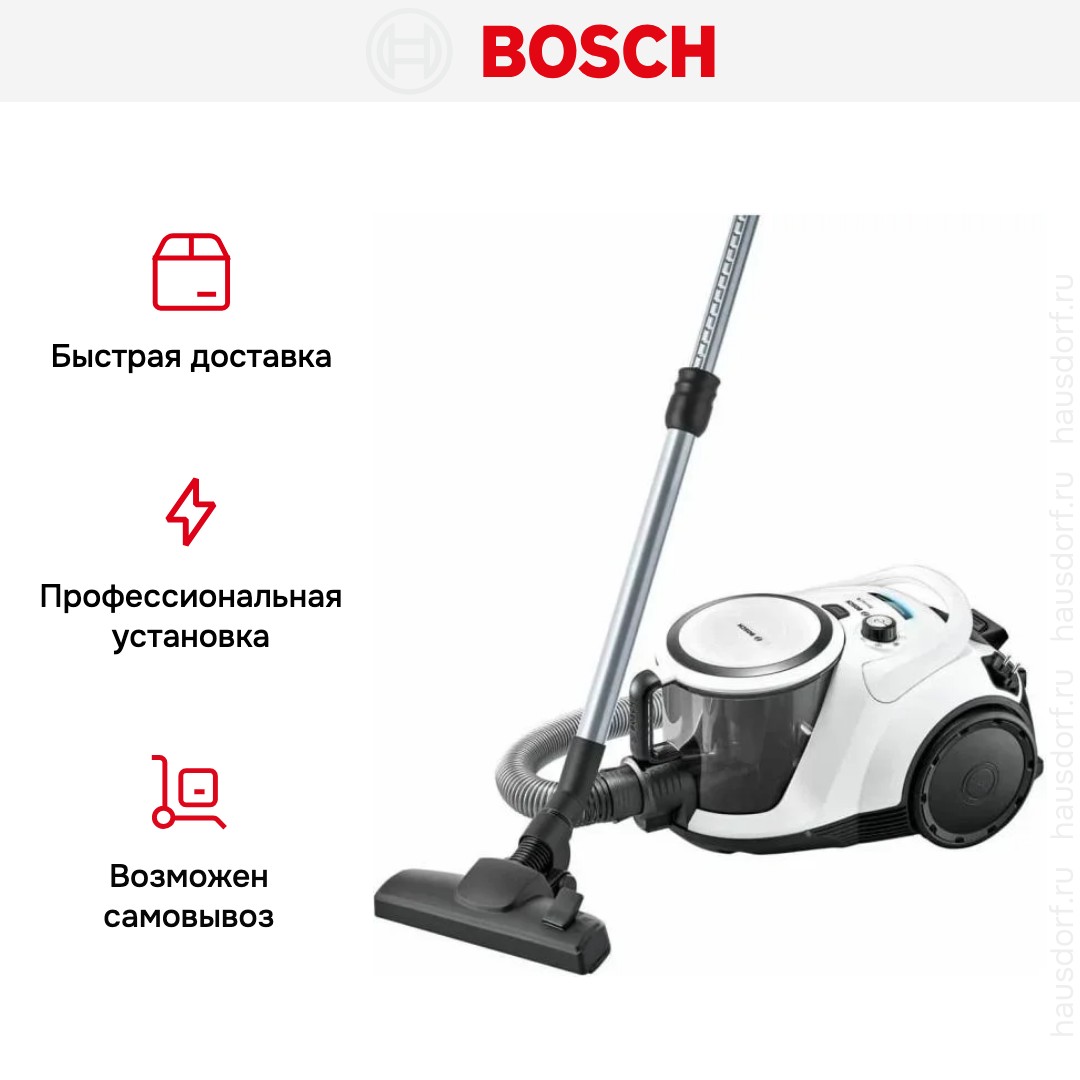 Пылесос Bosch BGS41K332 имеет стандартную конфигурацию — корпус на колесах, крепящийся к нему шланг с трубками-удлинителями и насадками. Данная модель рассчитана только на сухую уборку, которой достаточно для большинства пользователей. Мощный поток воздуха позволяет быстро всасывать как мелкие, так и крупные частицы, волосы и шерсть. Основной цвет прибора — белый. В качестве пылесборника производитель установил стандартный контейнер. Пользоваться им легко и удобно: чтобы очистить, просто достаньте его и высыпьте все в мусорное ведро, а затем протрите или вымойте емкость изнутри. Объем заполнения пылесборника — 2.4 л.