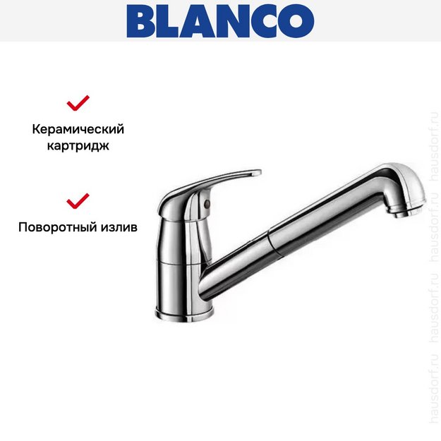 Смеситель Blanco Daras-S изготавливается из высококачественной нержавеющей стали с хромированием. Этот материал отличается повышенной прочностью, устойчивостью к воздействию высоких температур, легкостью в уходе. Однорычажная модель очень удобна в использовании: регулировать напор воды можно одной рукой. За смешивание горячей и холодной воды отвечает надежный, долговечный и легко заменяемый керамический картридж. Современный дизайн модели сочетается с компактными размерами. Высота излива составляет всего 11 см, а длина — 21,4 см: он подходит для моек с небольшими чашами. Вымыть посуду любого размера поможет выдвижной излив со шлангом в нейлоновой оплетке. Кроме того, вы без труда сможете наполнять глубокие кастрюли или вазы, а также использовать его вместе с мойкой с двумя чашами. Дополнительное удобство обеспечивает угол поворота излива на 90 градусов. Модель оборудована клапаном, который препятствует попаданию воды обратно в водопровод: благодаря этому напор воды остается постоянным.