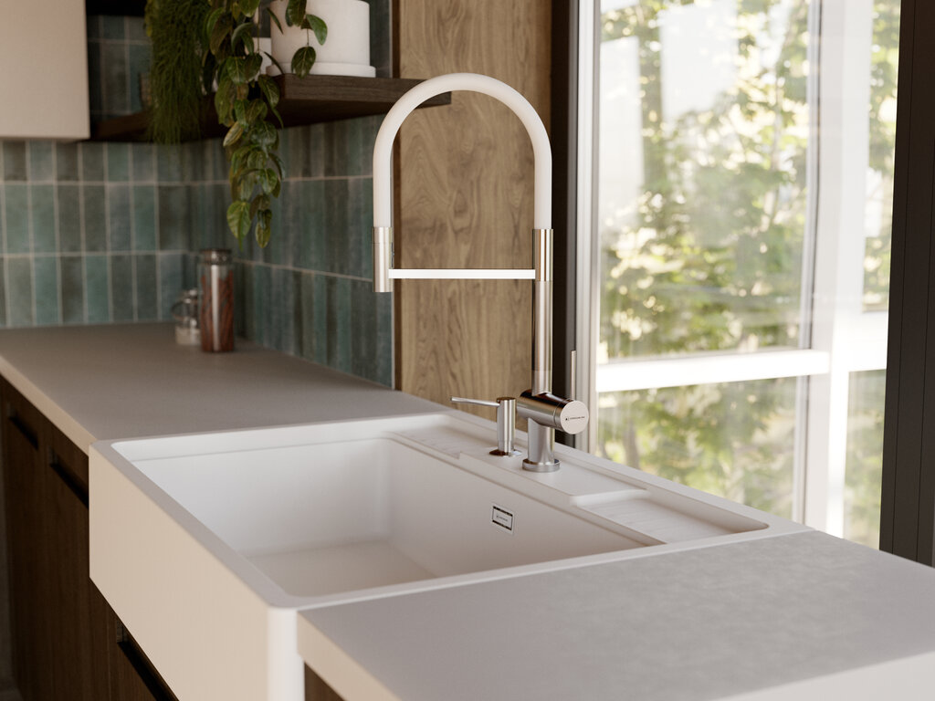 Специальная насадка позволяет выдвинуть излив как маленький шланг и направить струю в слишком высокую кастрюлю, которая не помещается под стационарным краном, на овощи в раковине, на загрязнения в неудобных уголках мойки, которые нужно удалить и т.д. Дополнительная деталь, которая повышает комфорт использования, — аэратор. Он делает поток воды мягче, насыщая его кислородом, таким образом дополнительно уменьшая ее расход: объем струи увеличивается за счет воздуха, а не за счет повышения напора из водопровода. К этой модели можно подключить фильтр для питьевой воды.