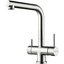 Рычаг для включения фильтрованной воды применяется в современных комбинированных смесителях, где из одного и того же излива подается и водопроводная, и питьевая вода. Такие смесители типа «два в одном» отличаются от обычных тем, что имеют не два подключения, а три, где третье соединяет смеситель с фильтром. Очищенная вода подается по изолированной трубке, проходящей внутри излива. Для удаления накипи, солей металлов, микроорганизмов и прочих вредных примесей могут применяться различные типы фильтров. Проточные фильтры устанавливаются под мойкой и включают несколько картриджей, которые необходимо менять по мере использования. С их помощью можно избавиться от таких примесей, как железо, хлор и многие другие. Устройства с системой обратного осмоса оснащаются диффузором, включающим картриджи для предварительной очистки и осмотическую мембрану, задерживающую практически все вредные примеси.