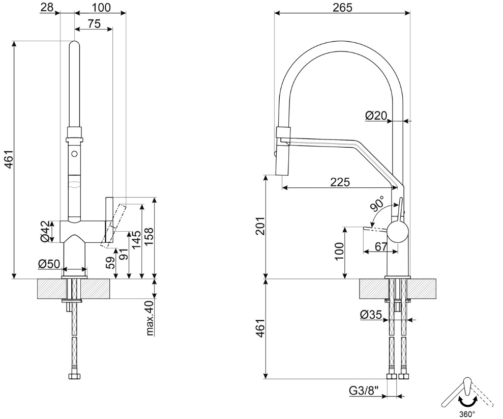 Горизонтальная установка привычна нам: смеситель устанавливается на краю мойки или столешницы. При вертикальной кран крепится на стену.