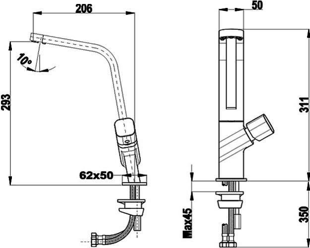 Горизонтальная установка привычна нам: смеситель устанавливается на краю мойки или столешницы. При вертикальной кран крепится на стену.