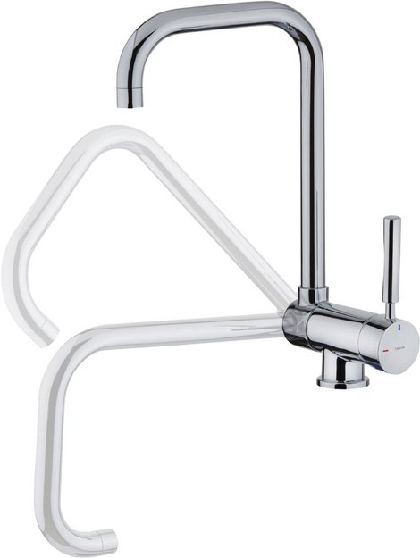 По высоте все смесители можно разделить на три группы: низкие, средние и высокие. Низкие обычно имеют один вентиль, а средние и высокие — по два. Высота низких смесителей составляет около 10-12 см, их выбирают для небольшой мойки глубиной около 120-140 мм и чаще устанавливают в ванной, чем в кухне. Кухонные модели могут дополняться выдвижными шлангами и поворотным изливом. Высота средних смесителей варьируется в пределах от 15 до 25 см: за стандартный принят размер 22 см. Они могут крепиться к мойке или к стене и подойдут для раковин глубиной около 170 мм. Для больших раковин глубиной более 20 см подойдут высокие изливы — от 25 до 50 см: они наиболее удобны, но требуют больше места.