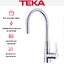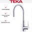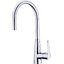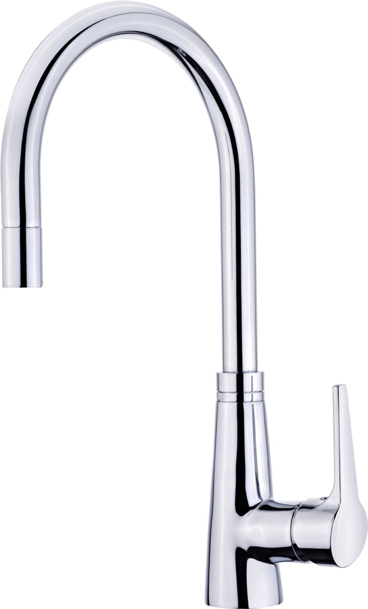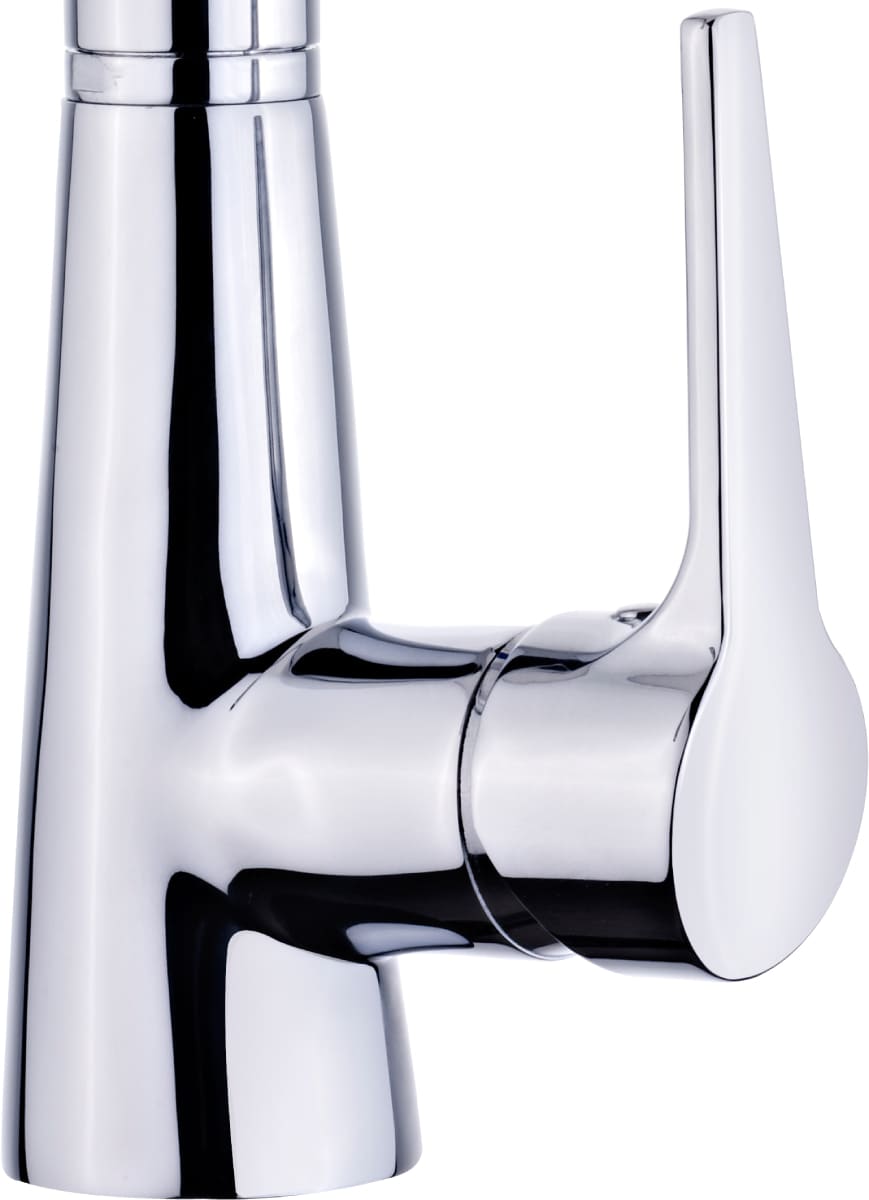 Выглядит элегантно и сдержанно: корпус и излив выполнены в хромовом цвете, что придаёт прибору зеркальный блеск и нейтральную универсальность для разных кухонных интерьеров. Компактная высота сопла сочетается с удлинённой формой излива, а плавные линии рычага создают впечатление продуманной геометрии без излишней вычурности.