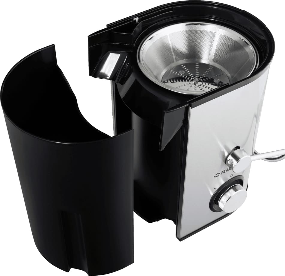 Корпус выполнен из прочной нержавеющей стали, что не только придаёт технике эстетичный, современный облик, но и гарантирует долговечность даже при интенсивном использовании. Сетка центрифуги также изготовлена из этого материала, устойчивого к коррозии и механическим повреждениям, что обеспечивает стабильную работу и лёгкость ухода. Резервуар для готового напитка сделан из безопасного пищевого пластика, прозрачного и удобного для контроля объёма.