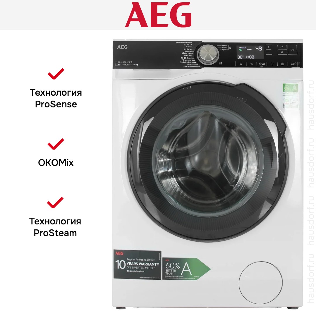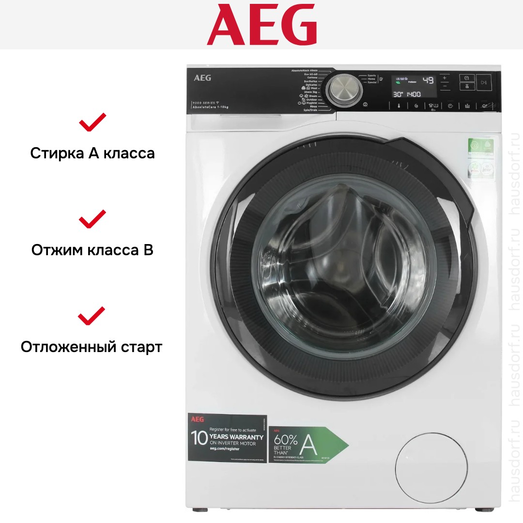 Стиральная машина АЕГ LFR95146SUE выпущена в стандартной конфигурации — устанавливается отдельно, поэтому рекомендуем заранее выделить для нее место в квартире. Благодаря классической фронтальной загрузке она привычна и удобна даже для тех, кто не очень разбирается в технике. В барабан помещается большое количество белья, что подойдет большим семьям или тем, кто часто стирает объемные вещи — постельное белье, верхнюю одежду. Максимальная загрузка: 10 кг.