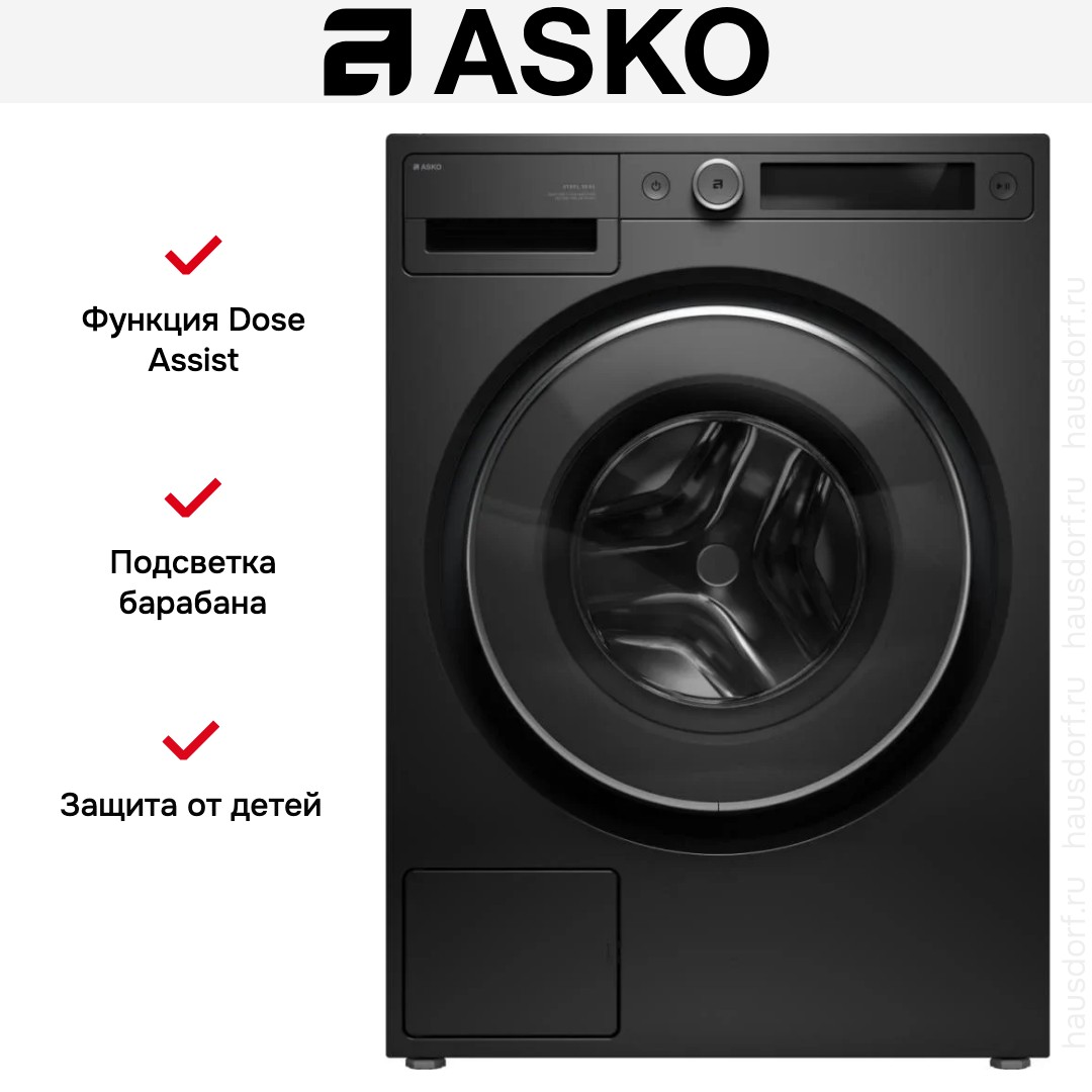 ASKO W5096RG создана для тех, кто ценит сочетание элегантного внешнего вида и продуманной функциональности: корпус в оттенке «черный графит» дополнен минималистичной фурнитурой и крупным круговым люком диаметром 31 см с надежным уплотнением Steel Seal™, что делает прибор стильным акцентом в любой современной комнате, не перегружая пространство; строгие линии и матовая поверхность подчеркивают премиальную роль техники, а встроенная подсветка барабана и TFT-дисплей с поворотным программатором и удобными кнопками превращают управление в понятный и интуитивный процесс. Внутренняя конструкция опирается на прочные материалы: бак и барабан из нержавеющей стали обеспечивают долговечность и бережную обработку тканей, а система ActiveDrum бережно перемещает белье при разных режимах. Мощный бесщеточный мотор BLDC и конструкция Quattro Construction™ гарантируют стабильную работу при высокой интенсивности, а режимы отжима до 1600 об/мин и режимы с замачиванием, интенсивной стиркой и функцией Quick Pro справятся с любыми загрязнениями, сохраняя форму и цвет вещей. Этот аппарат вмещает до 9 кг загрузки в барабан объемом 60 л и предлагает 23 программы, включая основные для хлопка, смешанных и цветных тканей, деликатные циклы (ручная стирка, шерсть, стирка рубашек, без отжима), специализированные опции для джинсов, верхней и спортивной одежды, программы для постельного белья, экспресс- и экономичные циклы, а также освежение паром и дополнительные варианты: белое белье, гипоаллергенные циклы для синтетики и хлопка, стирка по времени и отдельное управление отжимом и сливом. Для удобства пользователей реализовано интеллектуальное автоматическое дозирование жидкого моющего средства с функцией Dose Assist и повышенной эффективностью дезинфекции 4-log, есть отсрочка старта от 0,5 до 24 часов и программа самостоятельной очистки барабана. Практичные решения включают полную систему защиты от протечек AquaBlockSystem, контроль дисбаланса, детскую блокировку панели и ножки с регулировкой высоты; прибор оснащен сливным насосом и чугунными противовесами, способны выдерживать температурный диапазон от холодной воды до 90°C при мощности нагрева 2 кВт, а длина сетевого кабеля и шлангов обеспечивает гибкость установки. Класс энергоэффективности, стирки и отжима — A, что позволяет сочетать экономию ресурсов и высокое качество обработки. Несмотря на внушительный вес в 91,1 кг и габариты 85×59,5×57,2 см, техника продумана для удобной интеграции в жилое помещение и рассчитана на ежедневную нагрузку семьей, требующей надежности и широких возможностей настройки циклов; черный графит в сочетании с лаконичной панелью управления делают модель элегантным и функциональным решением в категории стиральная машина.