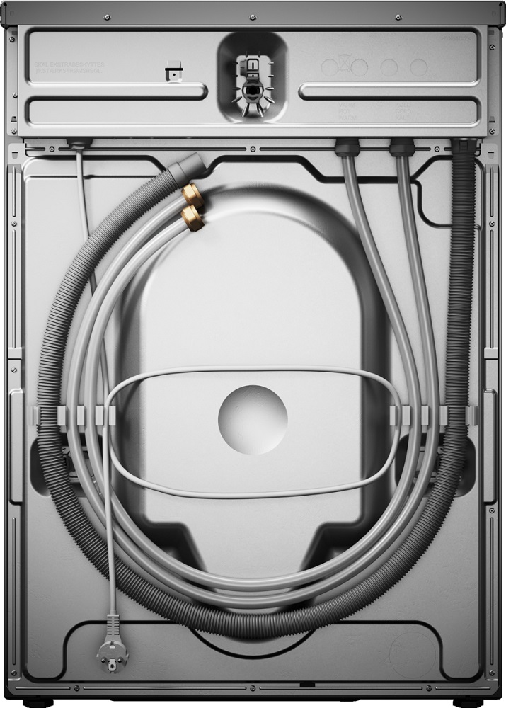 Конструкция задней панели упрощает подключение. Шланги и кабель аккуратно размещаются внутри корпуса, позволяя установить машину вплотную к стене.
