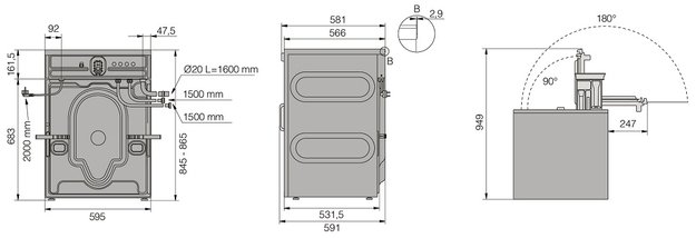 Габариты устройства: ширина — 59,5 см, глубина — 68 см, высота — 85 см. Вес машины около 91 кг. Подключение осуществляется к стандартной электросети 220–240 В.