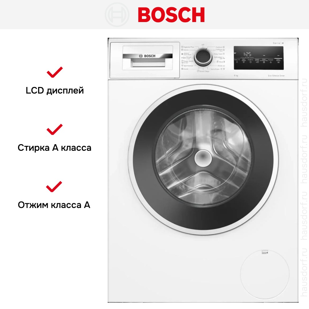 Цвет этой стиральной машинки — белый. В данной модели Bosch используется барабан VarioDrum. Его конструкция разработана специально для более бережной, но при этом все еще эффективной стирки. Мотор: EcoSilence Drive. Благодаря ему машина работает тише, потребляет меньше электроэнергии, сохраняя при этом необходимую мощность.