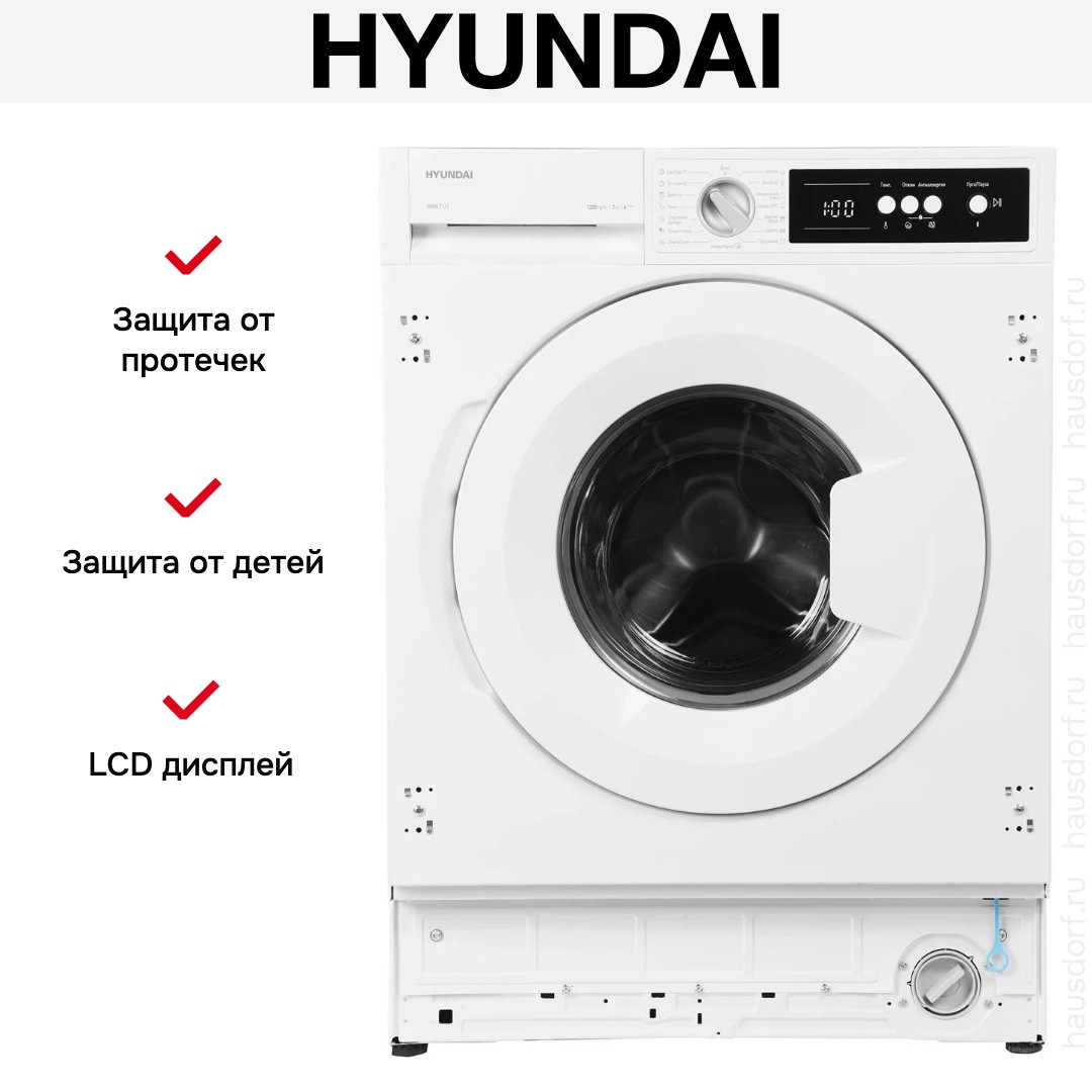 Стиральная машина Hyundai HWM-7121 представляет собой встраиваемое решение для домашней прачечной, сочетающее компактные размеры и продуманный функционал. Корпус белого цвета и белая лицевая дверца легко интегрируются в кухонный гарнитур, а полное встраивание оставляет видимой лишь панель управления. Габариты для монтажа 82×60×58 см и стандартные внешние параметры 81.8×59.8×54.4 см позволяют установить прибор в нишу с минимальными доработками. Диаметр люка 30 см и угол открытия 120° упрощают загрузку белья и размещение корзин при стирке, а ножки с регулировкой высоты компенсируют неровности пола.