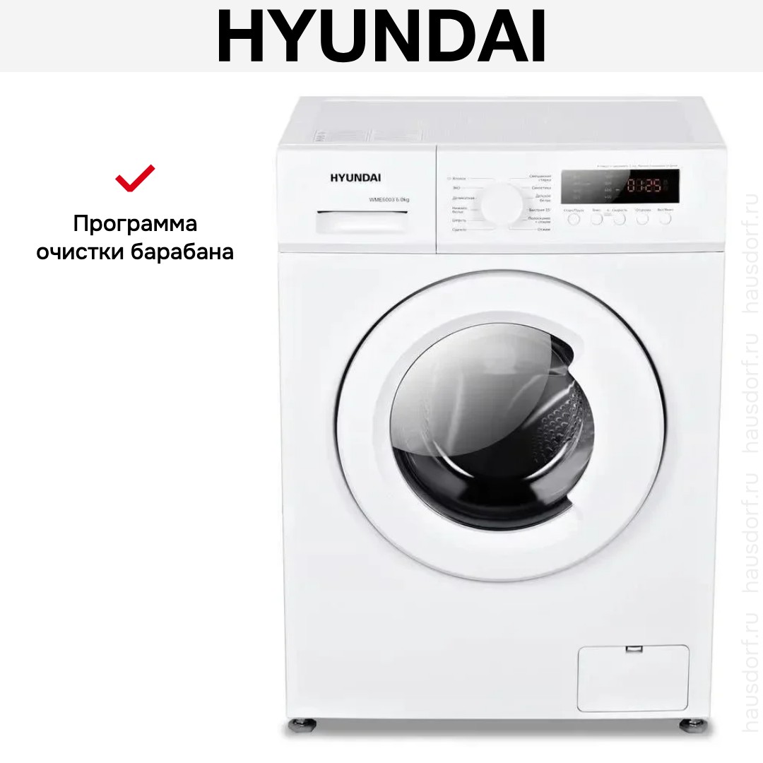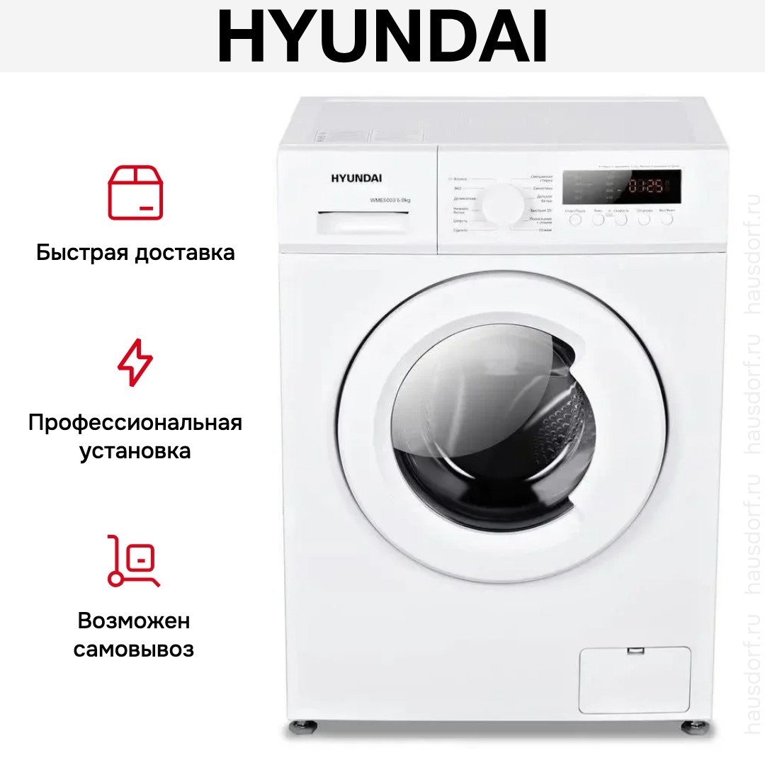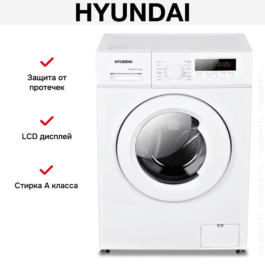 Стиральная машина Hyundai WME6003 сочетает в себе компактный форм‑фактор для дома и функциональность, востребованную в повседневной жизни. Отдельностоящая фронтальная конструкция вписывается в стандартные ниши и оставляет место для доступного обслуживания. Корпус белого цвета и белый люк выглядят нейтрально и органично впишутся в интерьер любой прачечной или кухни. Глубина 44 см и габариты 85×59.5×44 см позволяют установить прибор даже в ограниченном пространстве. Поворотный программатор и цифровой дисплей упрощают выбор режима и контроль времени цикла.